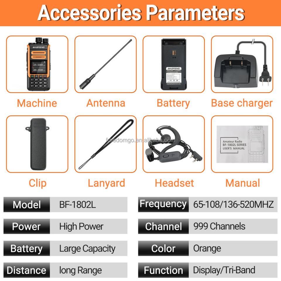 วิทยุสื่อสารแบบมือถือ BF-1802L กำลังส่งสูง 5 วัตต์ ระยะไกล คลื่นความถี่ VHF/UHF กันน้ำระดับ IPX-1 999 ช่องสัญญาณ แบตเตอรี่ 1000-1500mAh ระดับมืออาชีพ ระบบอนาล็อก