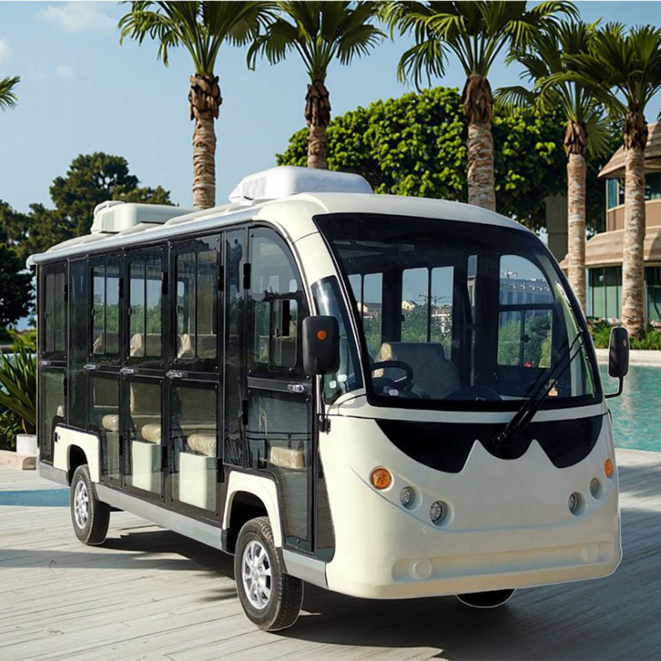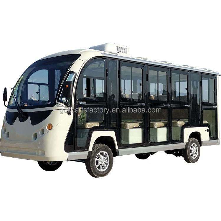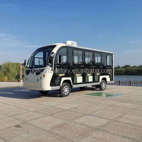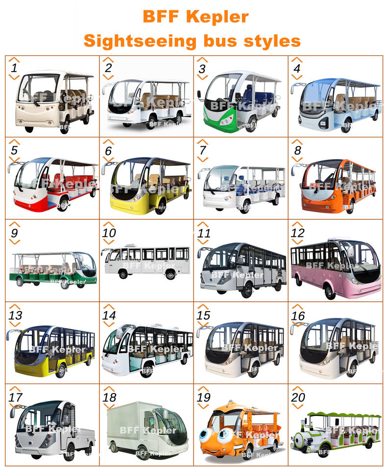 รถกอล์ฟอลูมิเนียม 14 ที่นั่ง ยี่ห้อ BFF Kepler ได้รับการรับรองมาตรฐาน CE ผลิตในจีน พร้อมมอเตอร์ AC แบตเตอรี่ลิเธียม/ตะกั่วกรด รถบัสไฟฟ้าสำหรับเที่ยวชมสถานที่
