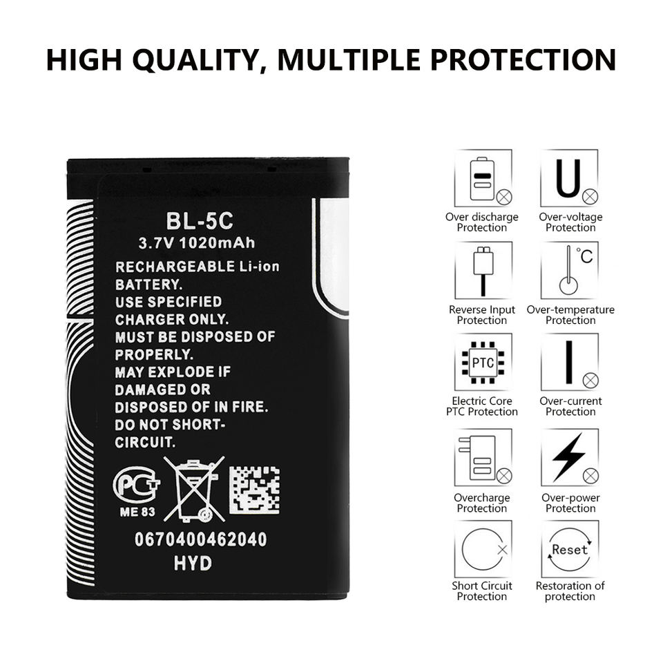 BL-5C BL5C BL 5C 3.7V 1200MAh การเปลี่ยนแบตเตอรี่ลิเธียมสำหรับ Nokia 1100 1110 1112 1200 1208 1600 2300 2600 2610 3100 3110 5130