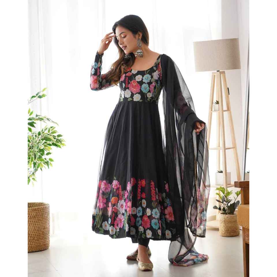 ชุดสูท anarkali organza นุ่มแท้สีดำมีสี DKB-25เย็บเต็ม