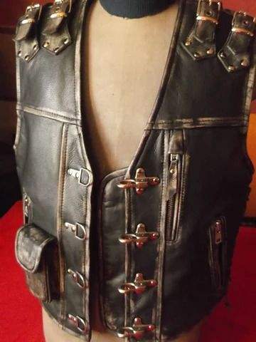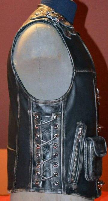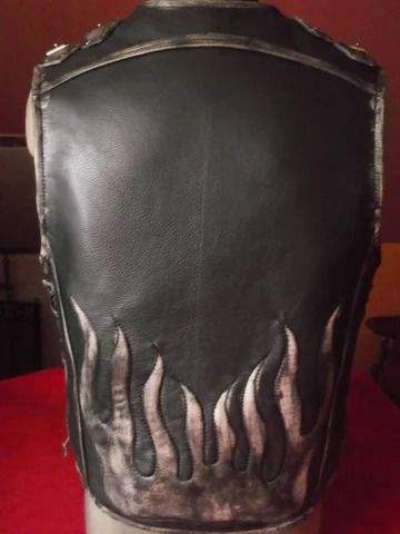 เสื้อกั๊กหนังวัวแท้สไตล์วินเทจสำหรับผู้ชาย ยี่ห้อ BLAZING FLAMES พร้อมหัวเข็มขัด ตกแต่งแบบดิสเทรส เหมาะสำหรับขี่มอเตอร์ไซค์และพกพาอุปกรณ์ป้องกันตัว