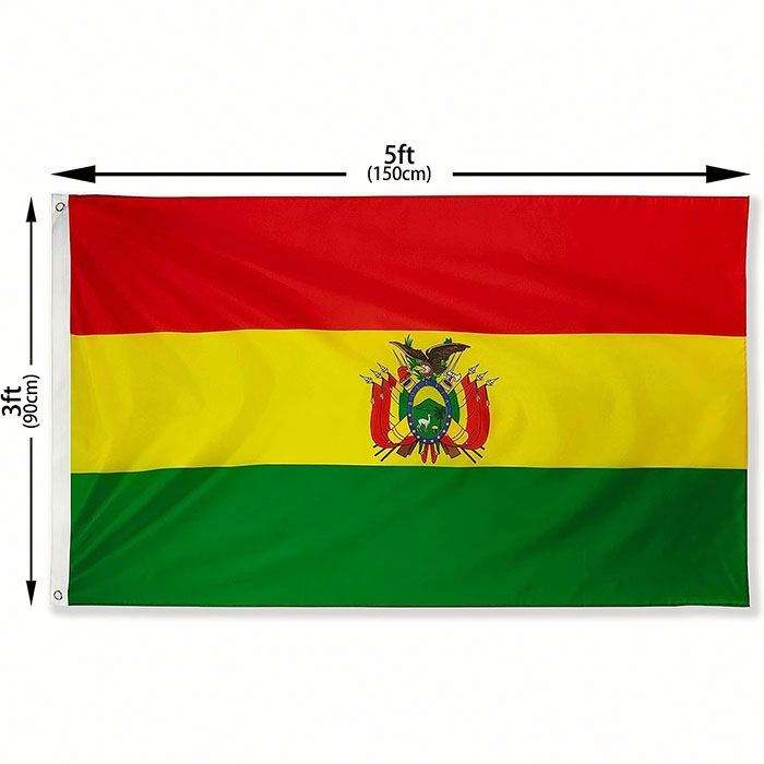 ธงชาติโบลิเวีย ขนาด 3x5 ฟุต ผลิตจากโพลีเอสเตอร์ ลายสามสี ตะเข็บคู่ พร้อมห่วงทองเหลือง