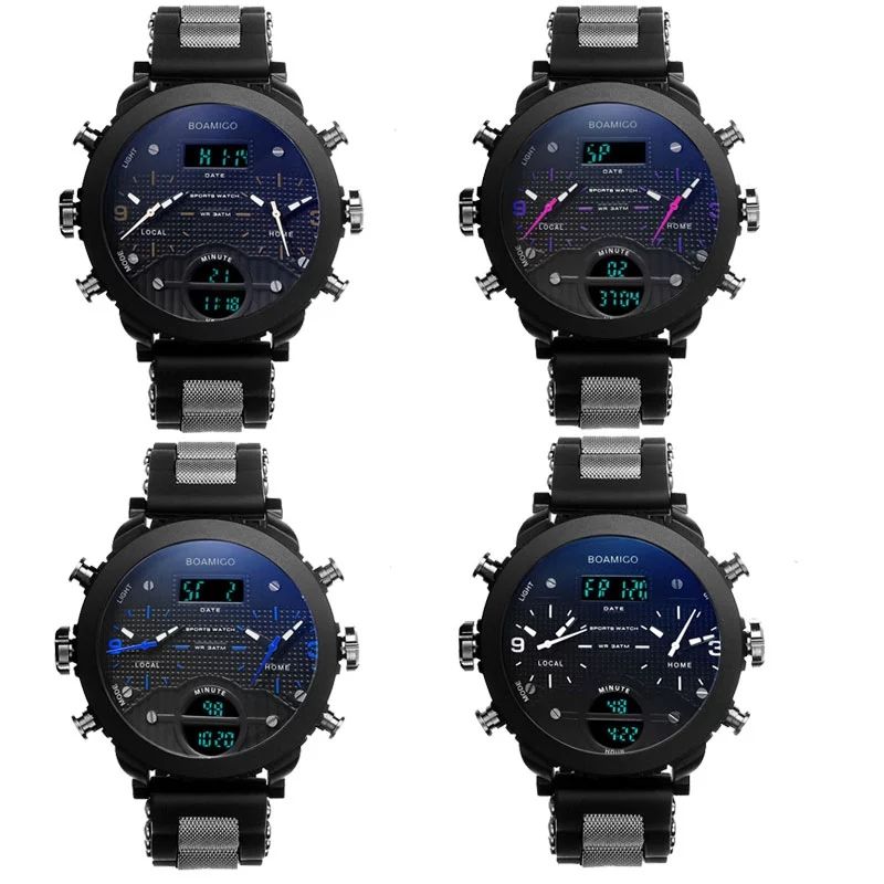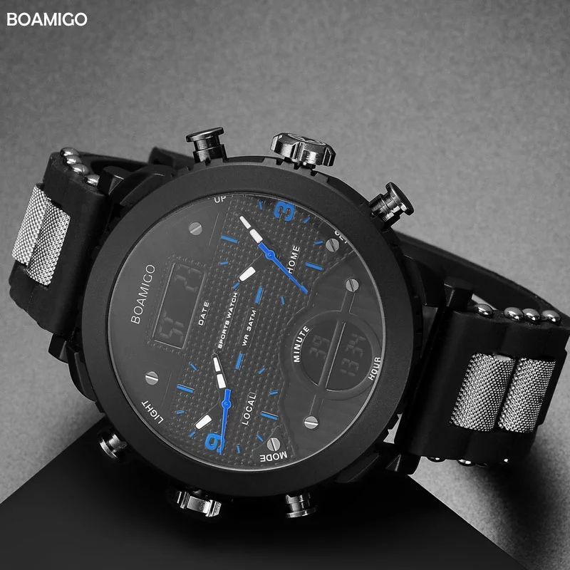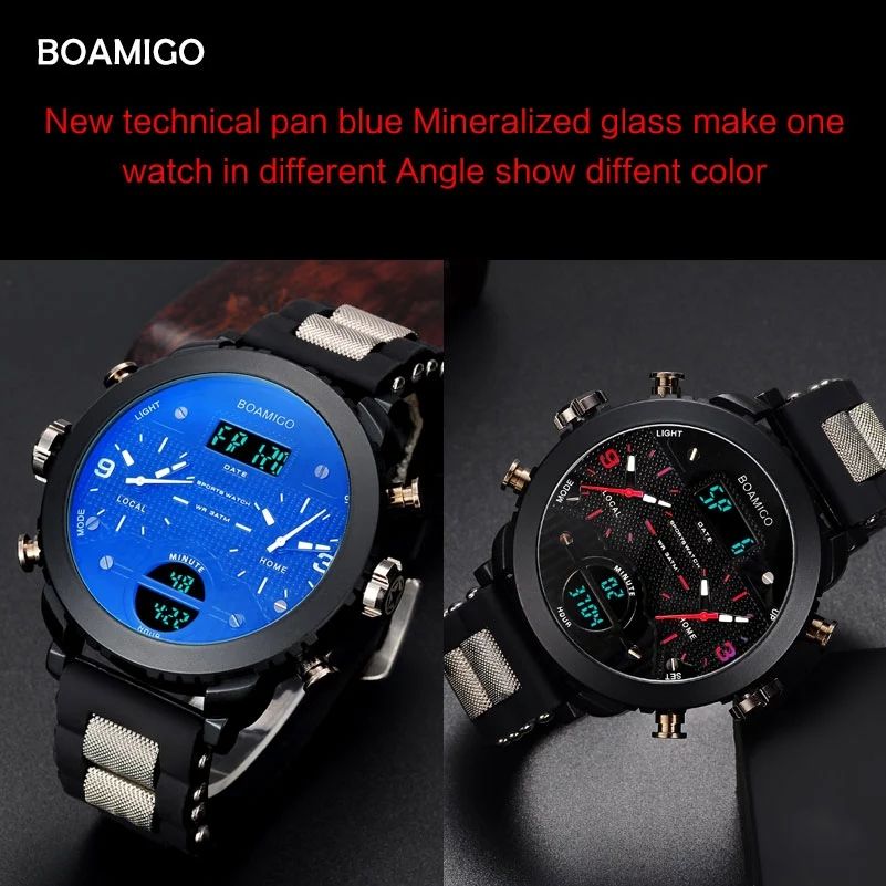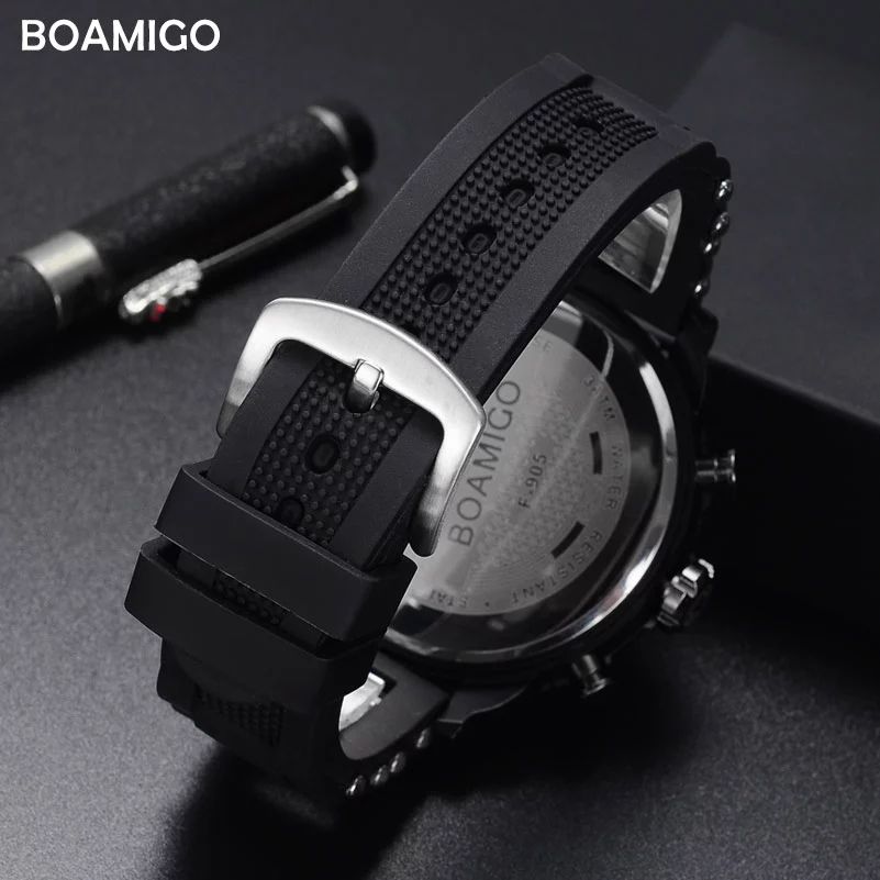 นาฬิกาข้อมือดิจิตอล BOAMIGO F905 สีดำสำหรับผู้ชาย สายยาง ดีไซน์ล้ำสมัย กันน้ำ แสดงเวลา 3 ระบบ นาฬิกาสปอร์ตโฆษณา