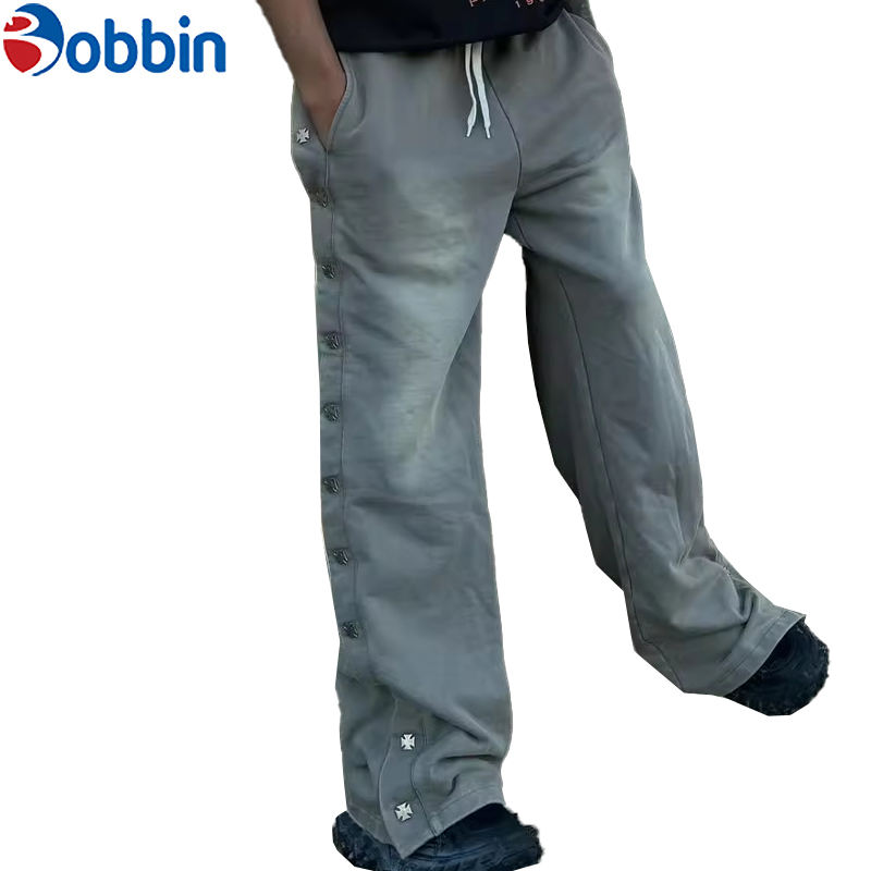 กางเกงวอร์มผู้ชายสไตล์วินเทจผ้าเทอร์รี่คอตตอนจาก BOBBIN INDUSTRIES ทรงขาบานแบบมีกระดุมด้านข้าง ล้างสีแบบ Acid Wash รับสกรีนโลโก้ตามสั่ง