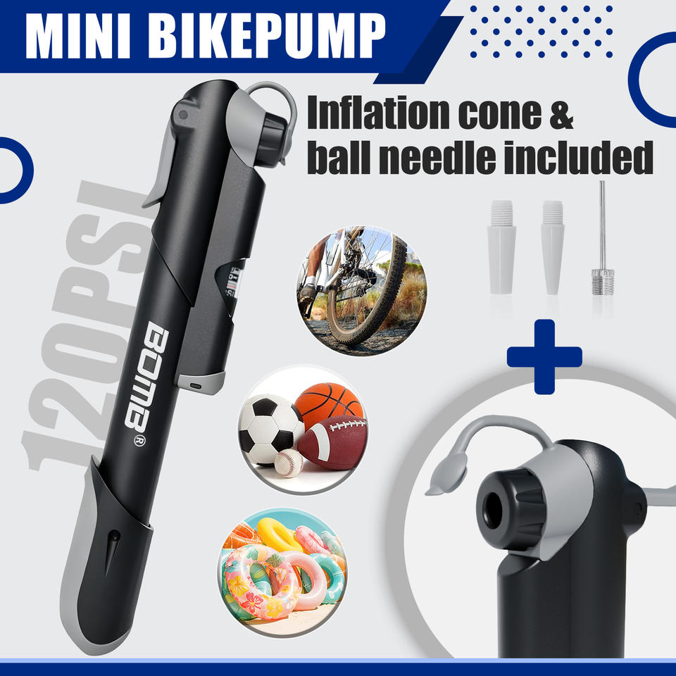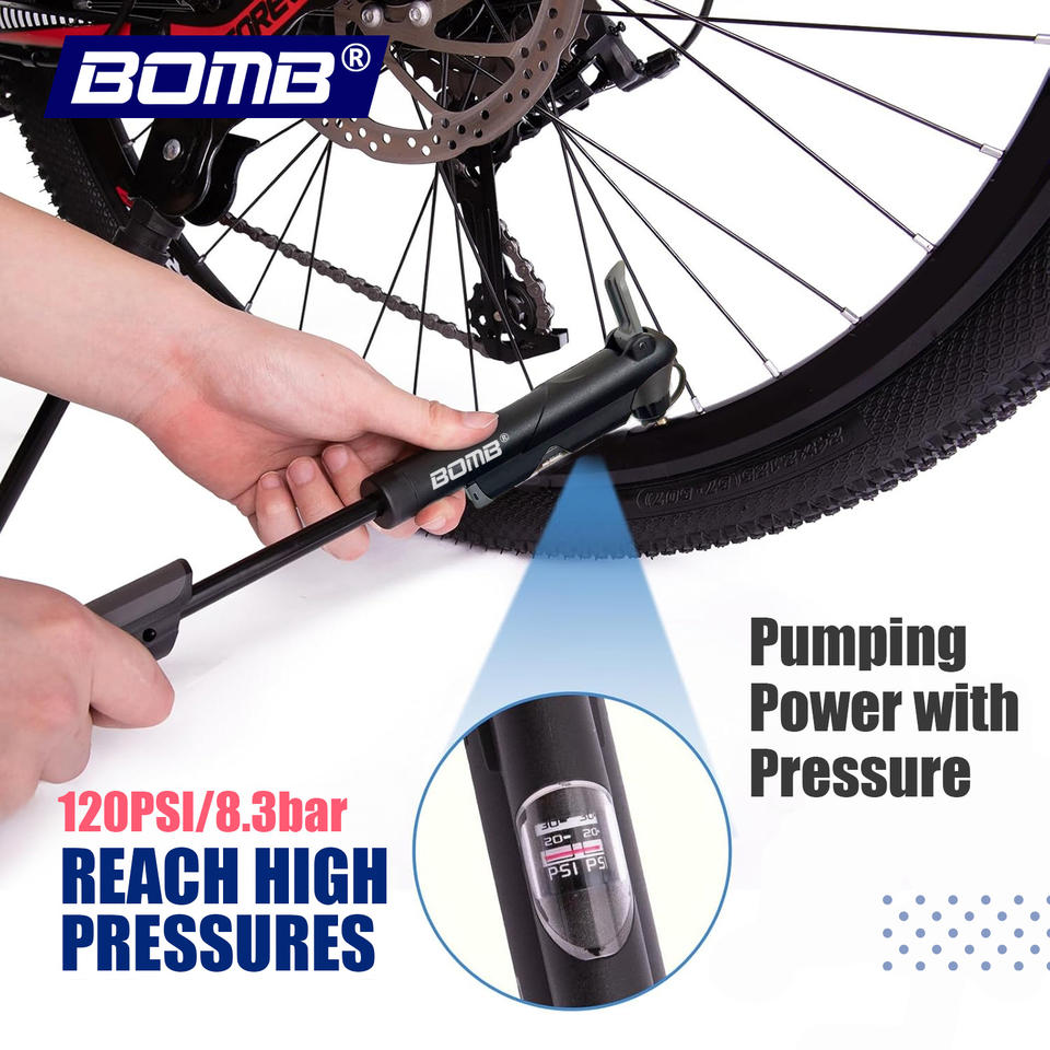 ปั๊มลมพกพา BOMB สำหรับจุ๊บ Schrader และ Presta ทำจากไนลอน ใช้สำหรับปั๊มจักรยาน บาสเกตบอล และอุปกรณ์ปั่นจักรยานอื่นๆ