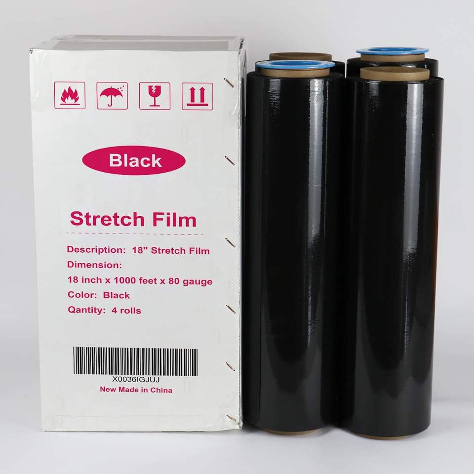 Bomei แพ็คยืดแข็งแรงทางอุตสาหกรรมพร้อมที่จับขนาด18 "x 1000ฟุตเกจวัด80แพ็ค4ห่อหดพลาสติกสีดำแบบยึดติดเอง
