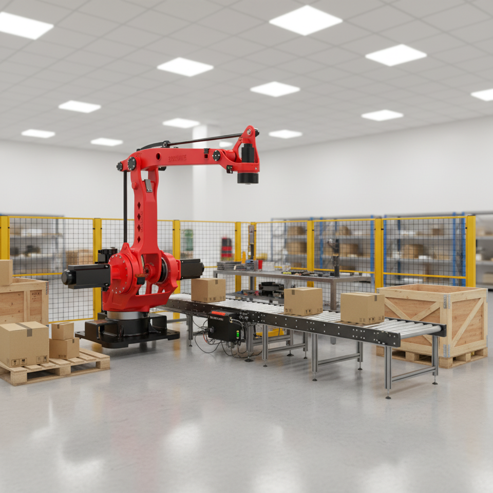 แขนกลหุ่นยนต์จัดเรียงสินค้าบนพาเลท 4 แกน