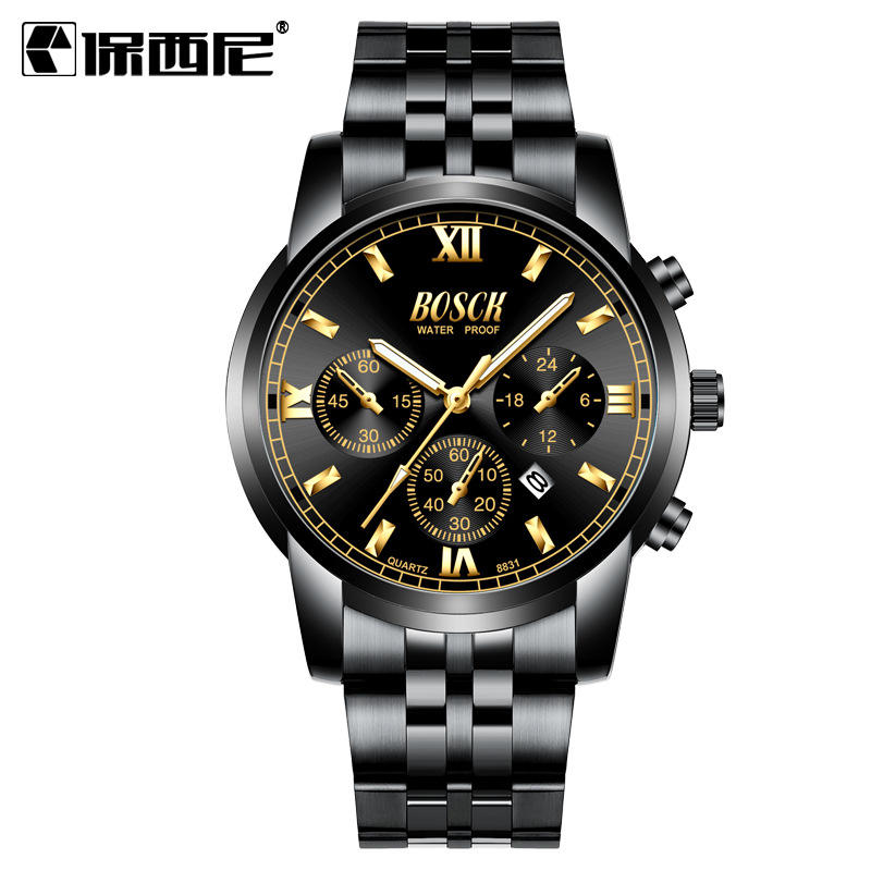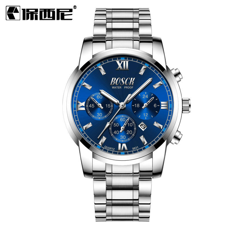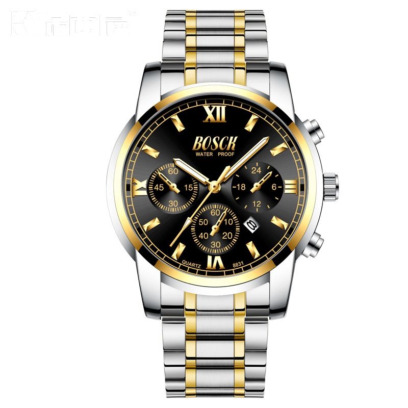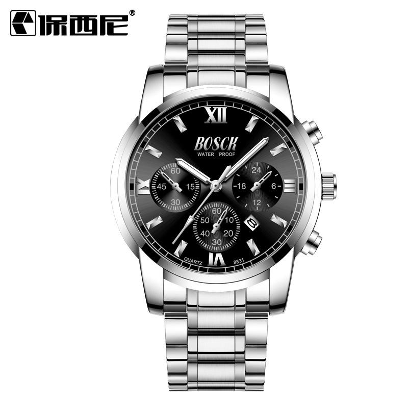 BOSCK นาฬิกาแฟชั่นสำหรับผู้ชายธุรกิจนาฬิกาควอทซ์กันน้ำคลาสสิกสายสแตนเลสปฏิทินนาฬิกาข้อมือ