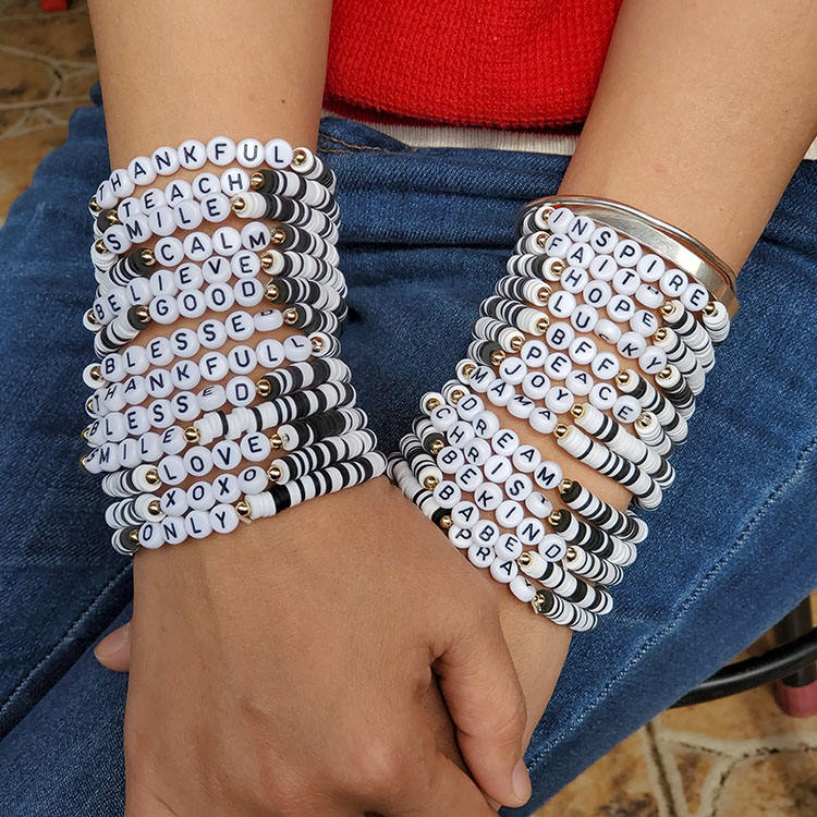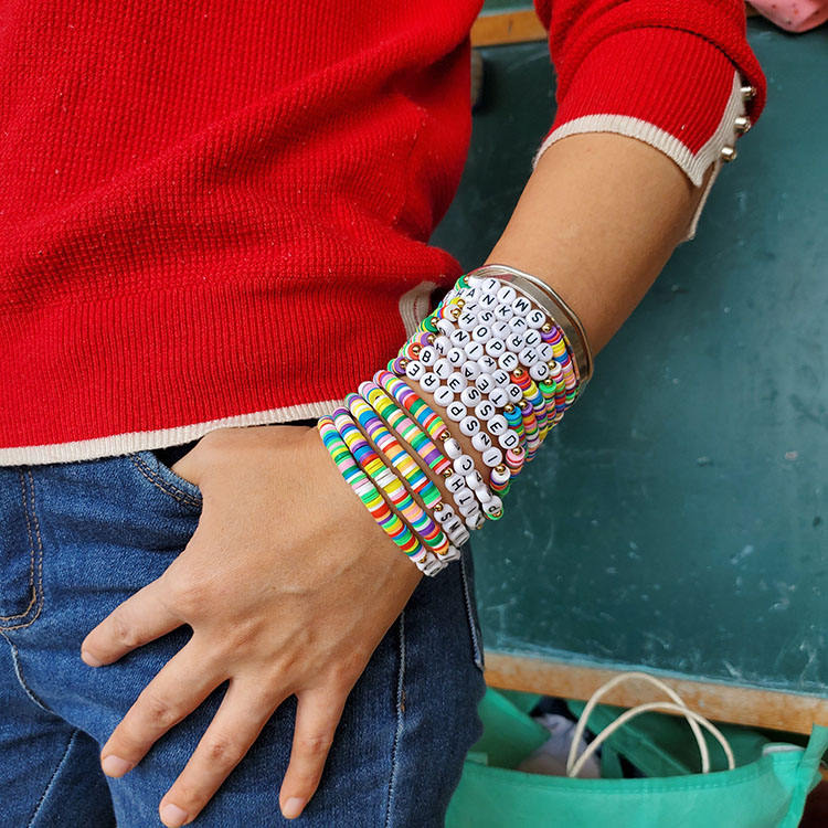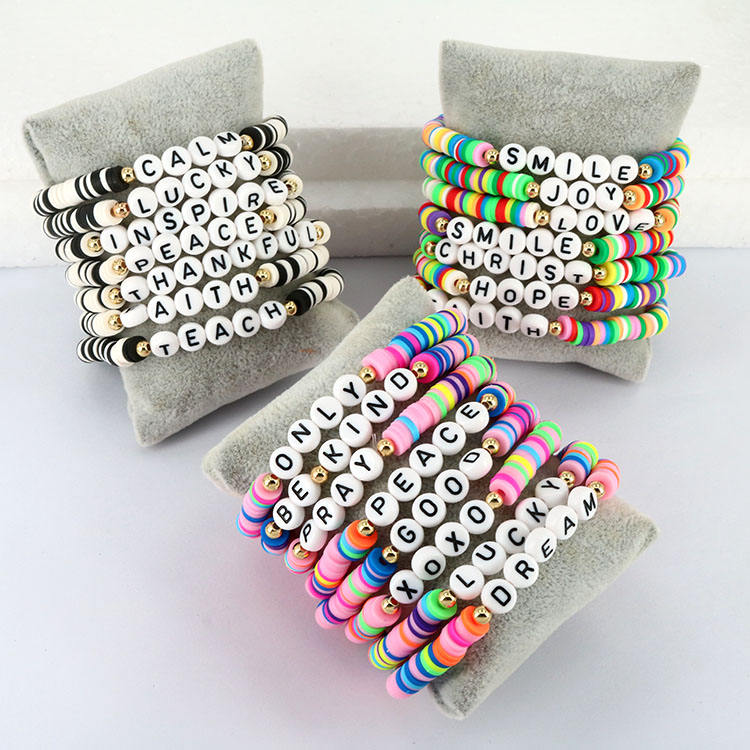 สร้อยข้อมือแบบซ้อนประดับด้วยลูกปัดดิสก์โพลิเมอร์สีรุ้งหลากสี พร้อมตัวอักษรคำคมสร้างแรงบันดาลใจ BP1020