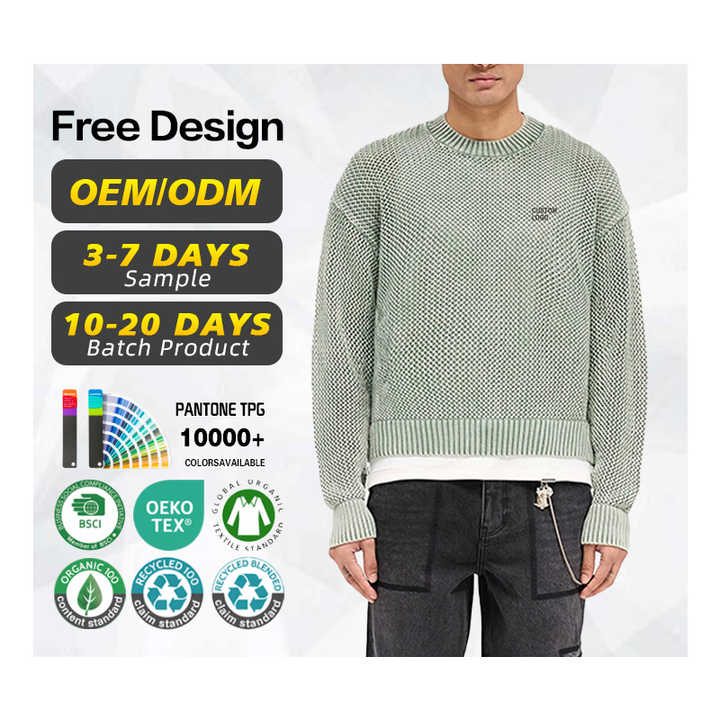 ผู้ผลิตเสื้อสเวตเตอร์ที่ได้รับการรับรองมาตรฐาน BSCI ออกแบบโลโก้ตามสั่ง เสื้อสเวตเตอร์ผู้ชาย ผ้าฝ้าย 100% สไตล์วินเทจ ถักแบบ Open Gauge ล้างสีแบบ Acid Wash