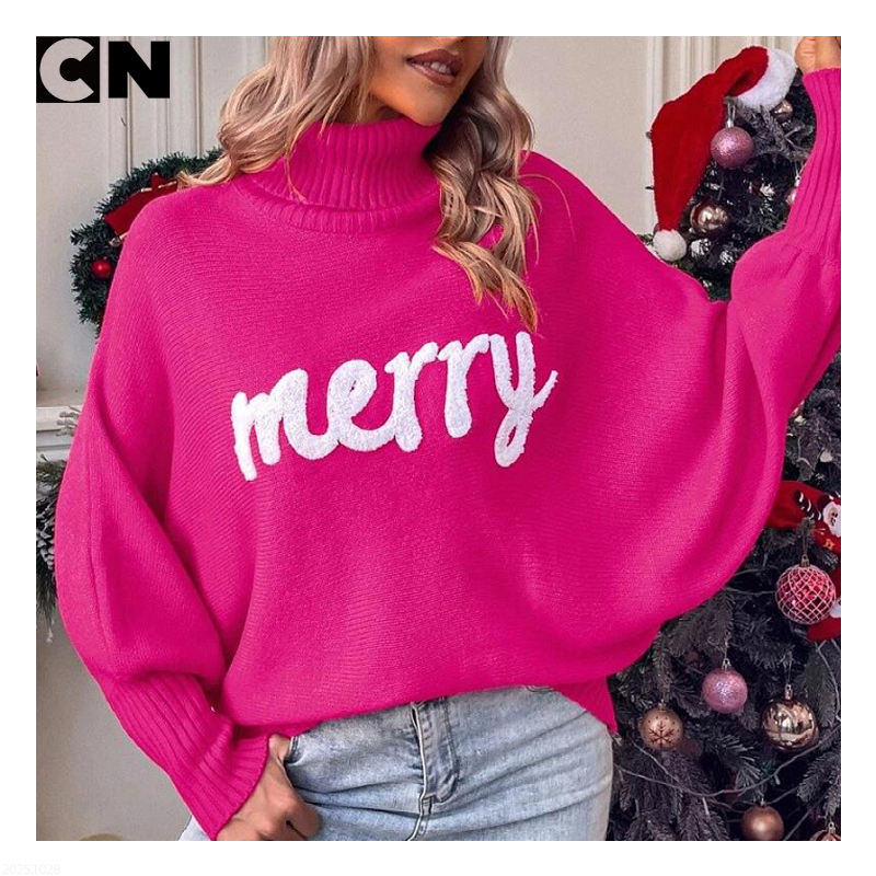เสื้อสเวตเตอร์คอเต่าสำหรับผู้หญิงเสื้อสเวตเตอร์ถักแบบสวมหัวมีแขนปีกค้างคาวผลิตจากโพลีเอสเตอร์