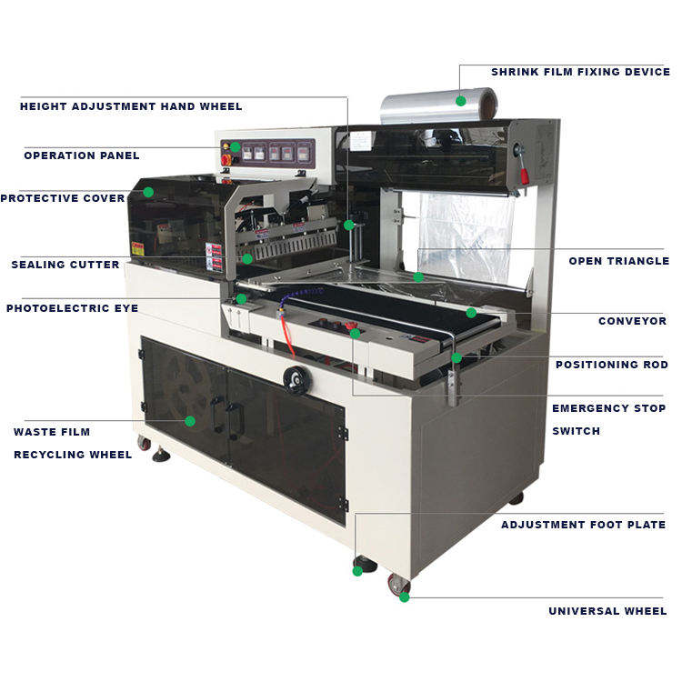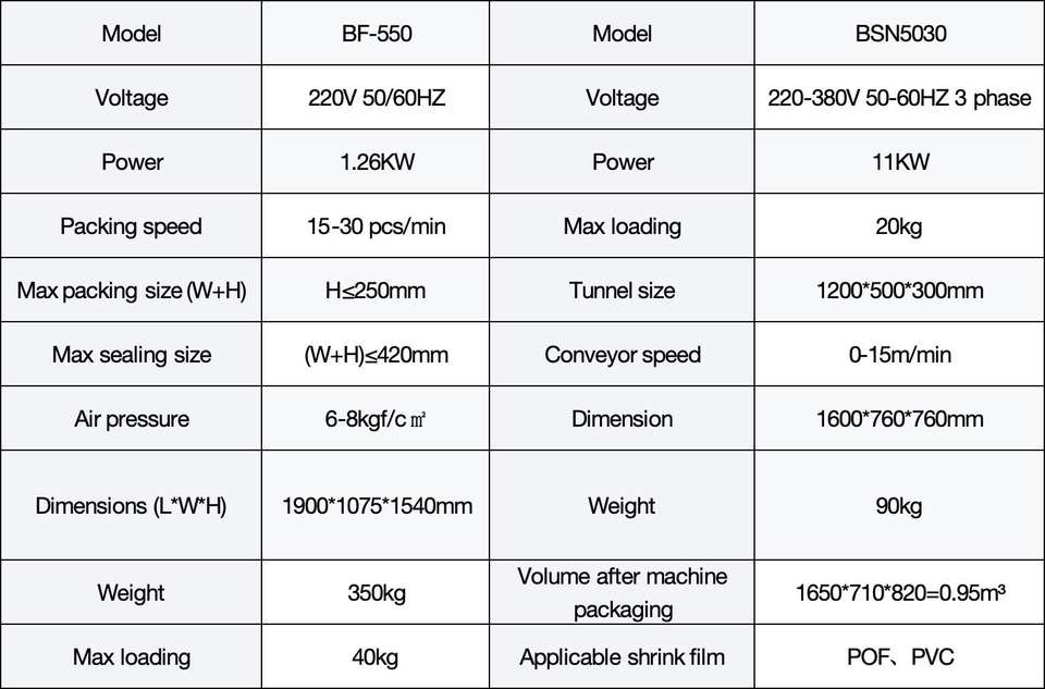 เครื่องบรรจุภัณฑ์แบบอุโมงค์หดความร้อนสำหรับถาดไข่ อาหาร เคมีภัณฑ์ และเสื้อผ้า รุ่น BSN5030+BF550 ความเร็ว 30 ชิ้น/นาที แบบนิวเมติกอัตโนมัติ
