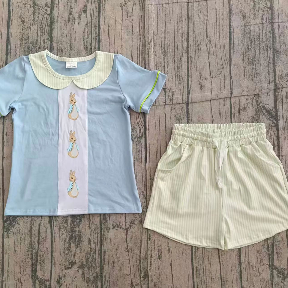 ชุด BSSO1564สำหรับเด็กผู้ชายชุดอีสเตอร์แขนสั้นสำหรับเด็กชุดพิมพ์ลายกระต่ายสีฟ้าสำหรับเด็กผู้ชายวัยหัดเดินงานตามสั่ง