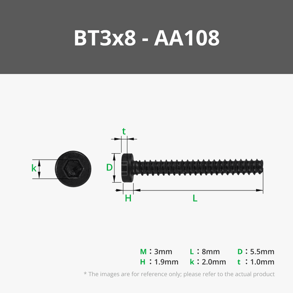 สกรูเกลียวปล่อยหัวจม BT3 (SHCS) เส้นผ่านศูนย์กลางหัว 5.5 มม. เกลียวหยาบแบบเมตริก ความลึกร่อง 1 มม. เหล็กกล้าคาร์บอน H2 สีดำ