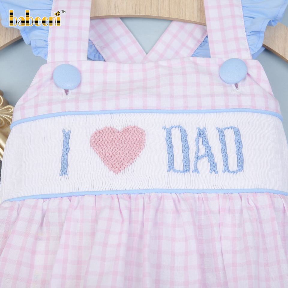 บาบีนี ผ้าฝ้ายออร์แกนิค 100% ได้รับการรับรองมาตรฐาน OEKO-TEX ป้องกันไฟไหม้ สีชมพู ลายหน้าต่าง ฉันรักพ่อ ปักมือ ติดกระดุมแป๊ก ชุดบอดี้สูทเด็ก