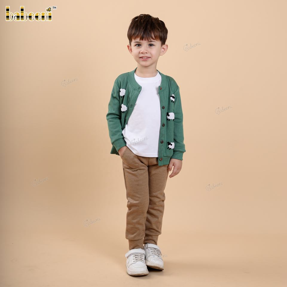 เสื้อคาร์ดิแกนเด็กผู้ชายแบรนด์ Babeeni ปักลายแกะด้วยมือ สีเขียวเข้ม ผ้าฝ้าย 100% สไตล์ลำลอง ขายส่ง เสื้อผ้าเด็กแบบสม็อค OEKO-TEX