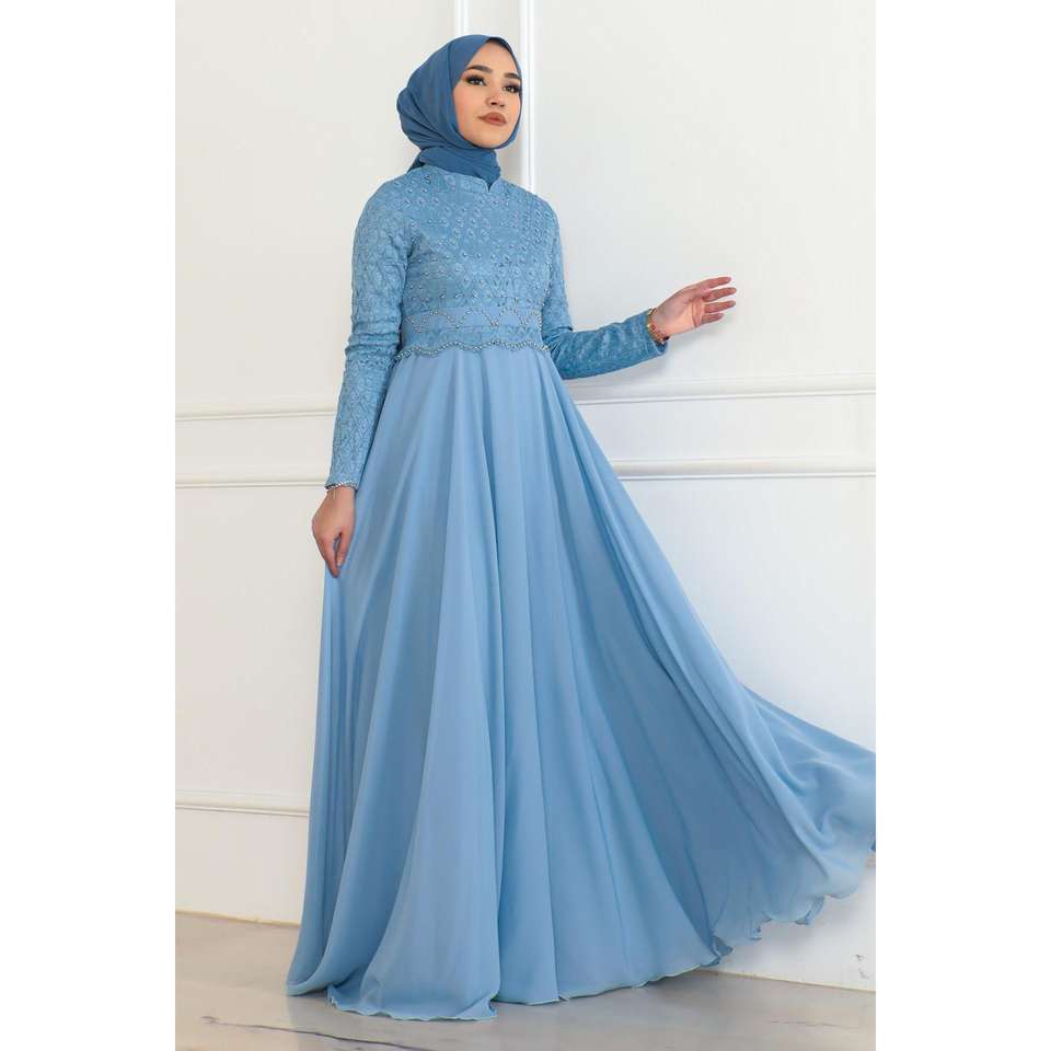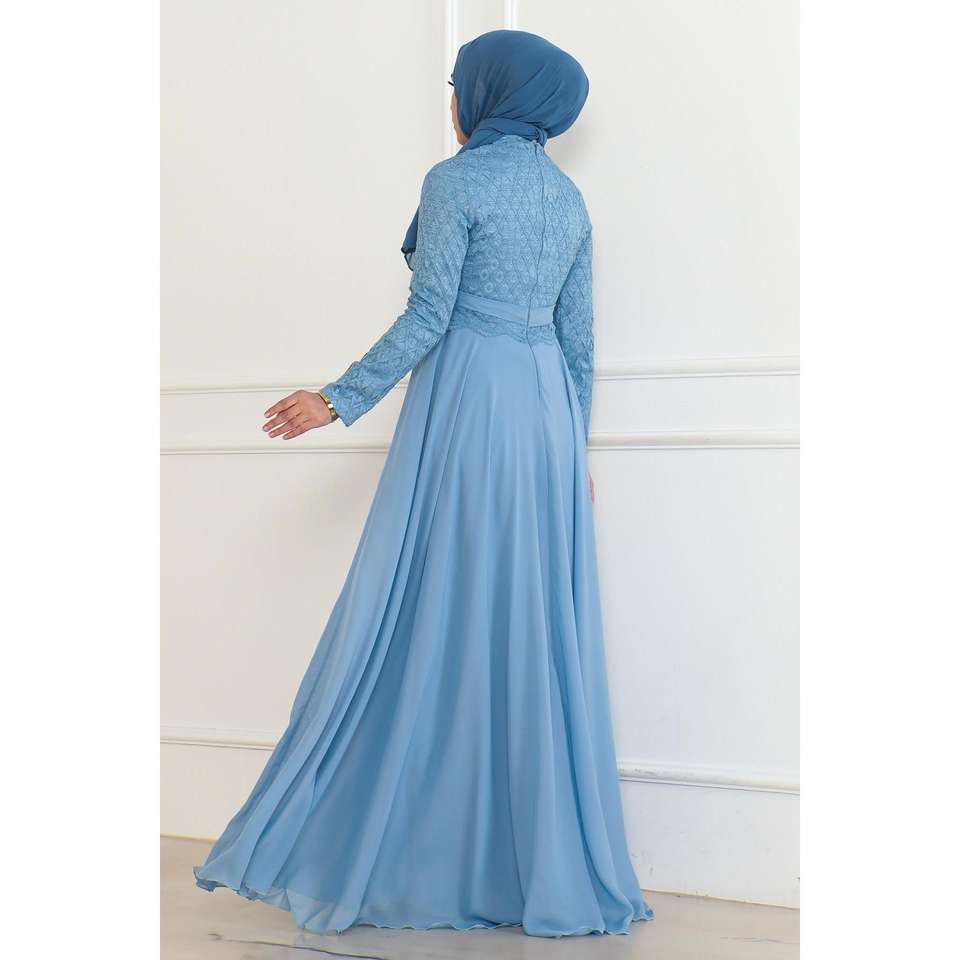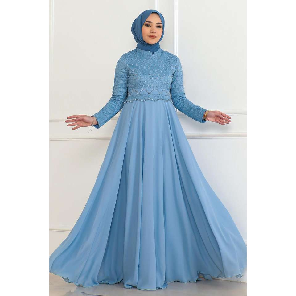 ชุดเดรสทรงเอไลน์สีฟ้าอ่อน รุ่น 6137 พร้อมลายปะติดแขนยาว คอวี ทำจากโพลีเอสเตอร์ 100%