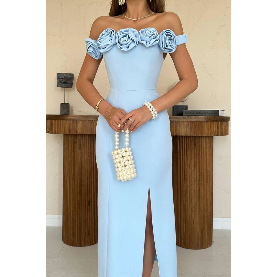 เดรสสีฟ้าอ่อนแบบเปิดไหล่ทรงเข้ารูป คอปกดอกกุหลาบ ผ้าซาติน สำหรับออกงานกลางคืน เอวทรงธรรมชาติ