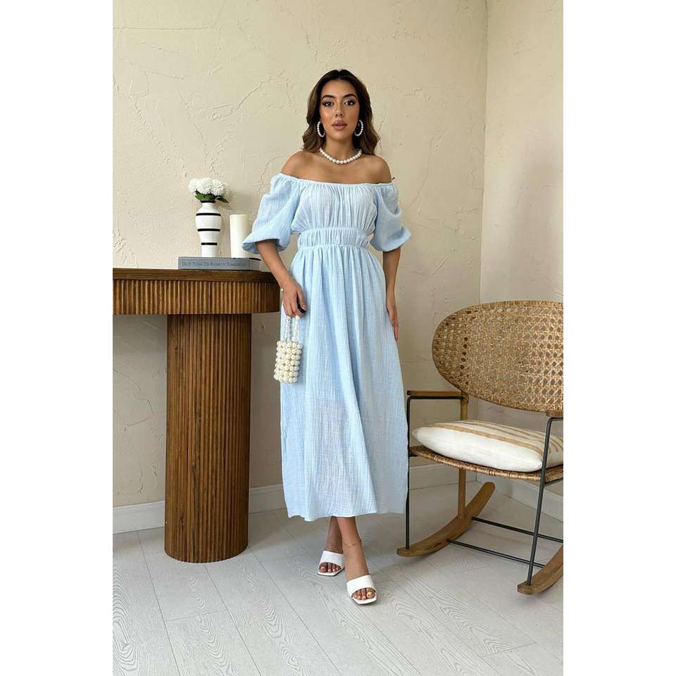 เดรสผ้าลินินสีฟ้าอ่อนแบบเปิดไหล่ เอวธรรมชาติ ทรงหลวม ระบายอากาศได้ดี ชุดลำลองสำหรับผู้หญิง