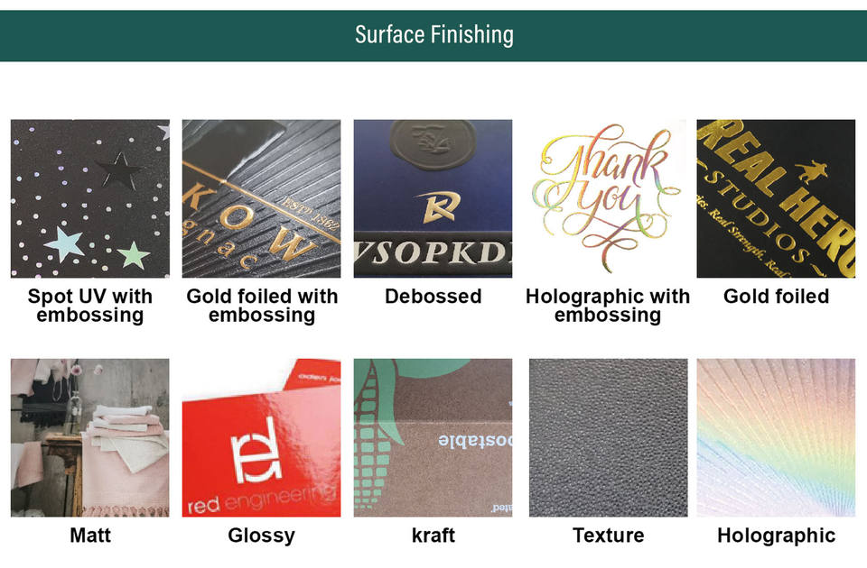 แมตต์เคลือบ, เคลือบเงา, การตอก, ลายนูน, เคลือบเงา, เคลือบยูวี, หายไป, ทองฟอยล์