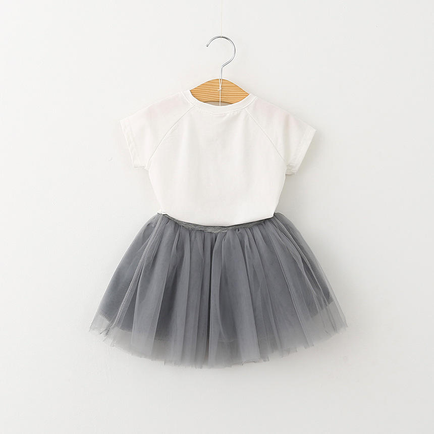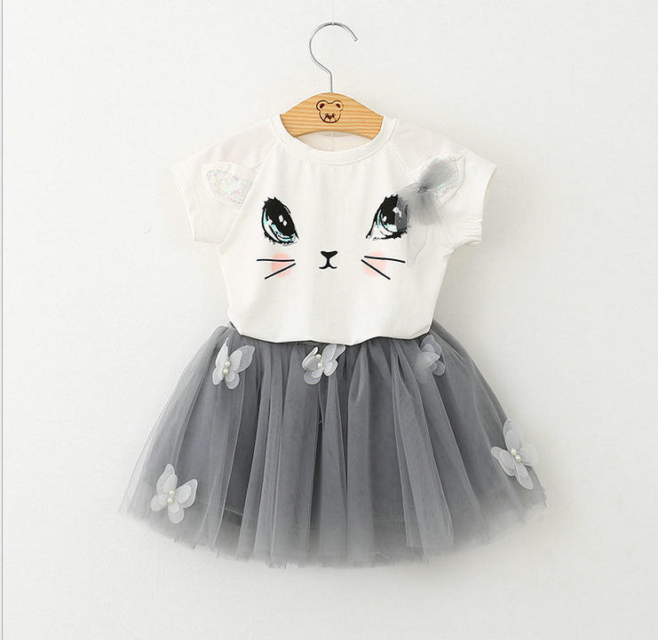 คำอธิบาย:ชุดเซ็ตเสื้อผ้าเด็กผู้หญิงหน้าร้อน บูติก ชุดกระโปรงลูกไม้ลายแมวน่ารัก