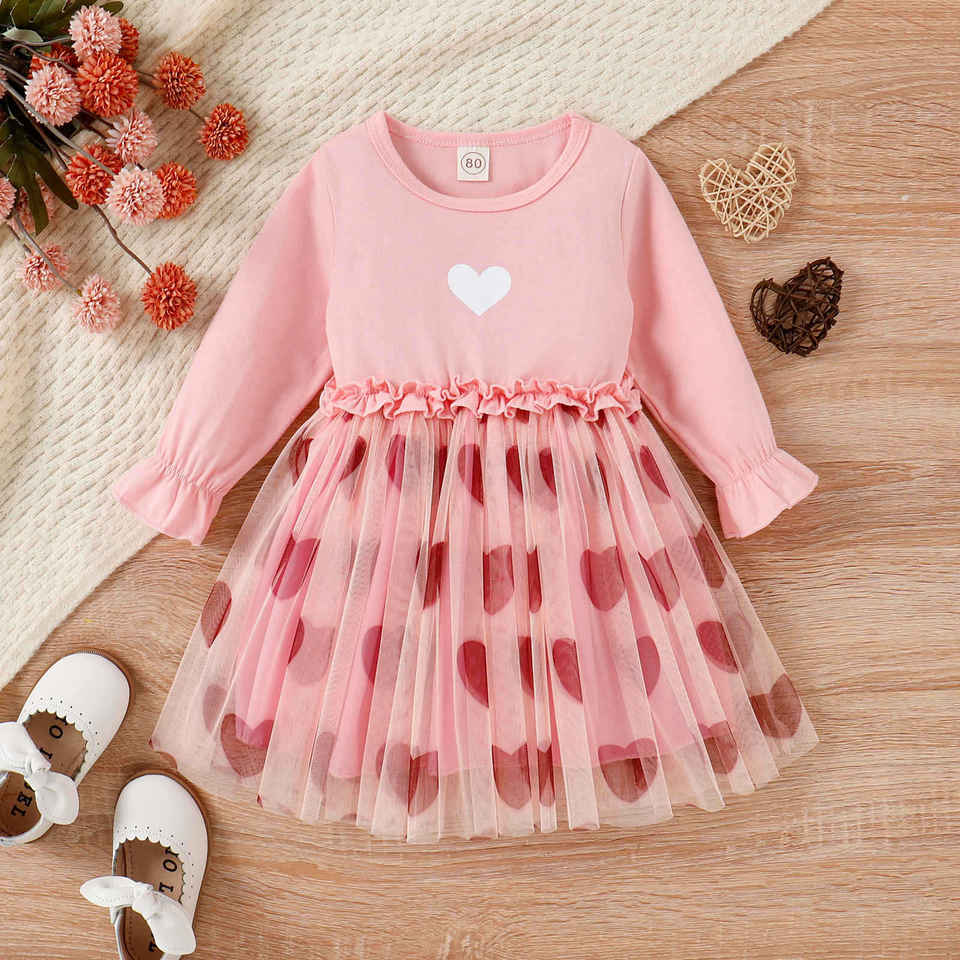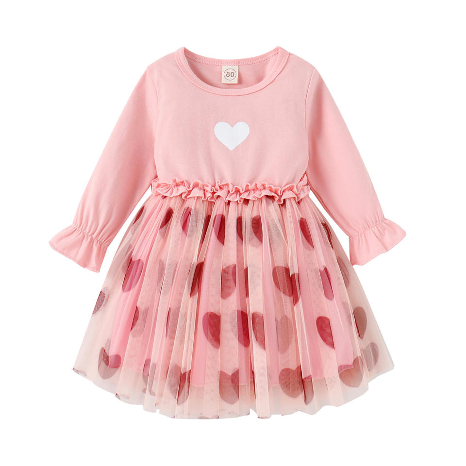 Baby Clothes Spring Long Sleeve Heart Print Tulle A-line Girls Dresses