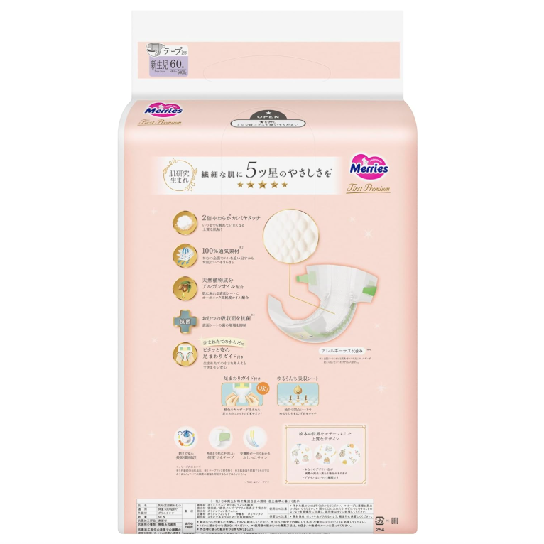 ผ้าอ้อมเด็กญี่ปุ่นแท้ ยี่ห้อ KAO รุ่น First Premium Jumbo Pack แบบเทป สำหรับเด็กแรกเกิด 60 ชิ้น แพ็คประหยัด ผิวแพ้ง่าย 4 แพ็ค