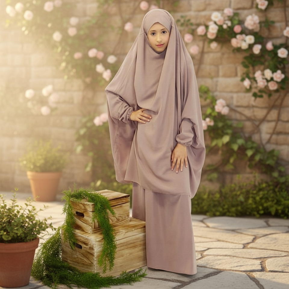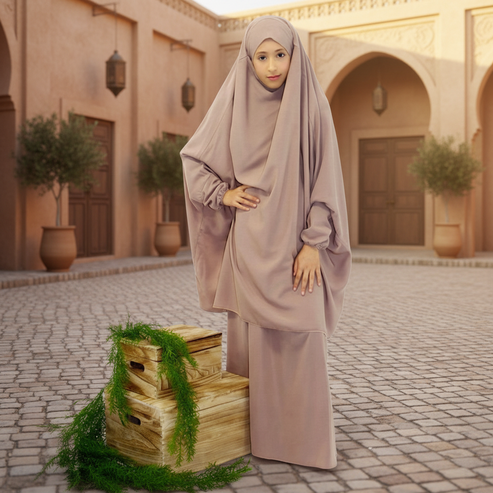 ชุดอาบายะห์เด็กผู้หญิงแบบอิสลามสีเบจ แขนยาว มีฮู้ด ระบายอากาศได้ดี ไซส์ใหญ่พิเศษ
