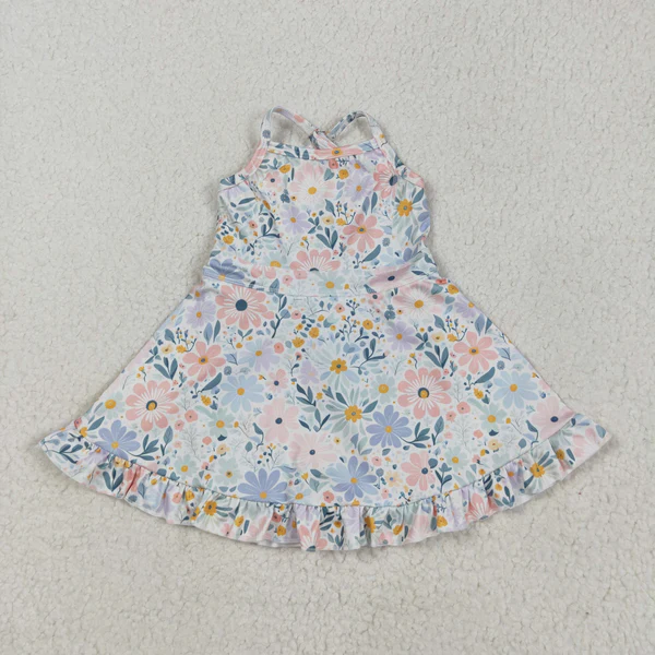 ชุดเดรสเด็กผู้หญิงแบบมีสายรัดลายดอกไม้ยาวระดับเข่า ชุดโยคะสำหรับพี่น้อง