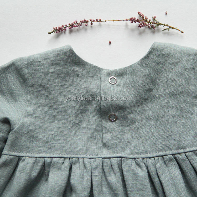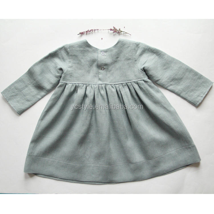 ชุดเดรสผ้าลินินสีเทาสำหรับเด็กผู้หญิง แขนยาวสำหรับฤดูใบไม้ร่วง คอทรงกลม ยาวคลุมเข่า ชุดสำหรับพิธีรับศีลล้างบาป ทำจากผ้าลินินที่ผ่านการซักล่วงหน้าแล้ว