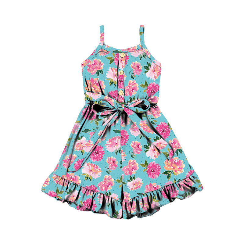 จั๊มสูทเด็กผู้หญิง แฟชั่นเด็ก ดีไซน์ผูกไหล่ เสื้อผ้าขายส่งฤดูร้อน ชุดรอมเปอร์ขาสั้นแบบชิ้นเดียว