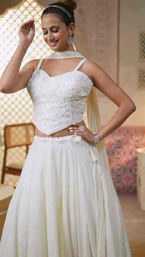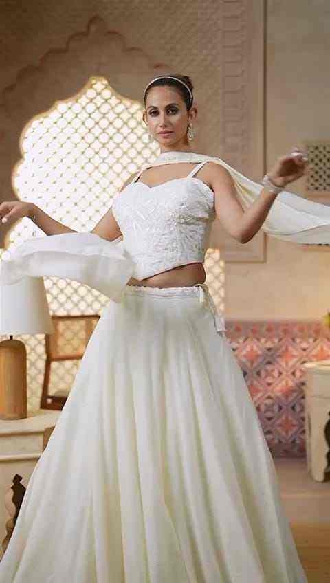 ชุดเลเฮนกา โจลีสีชมพูอ่อนปักลาย พร้อมเสื้อคอเว้าและกระโปรงผ้าไหมวิบวับ สำหรับใส่ในงานเทศกาล
