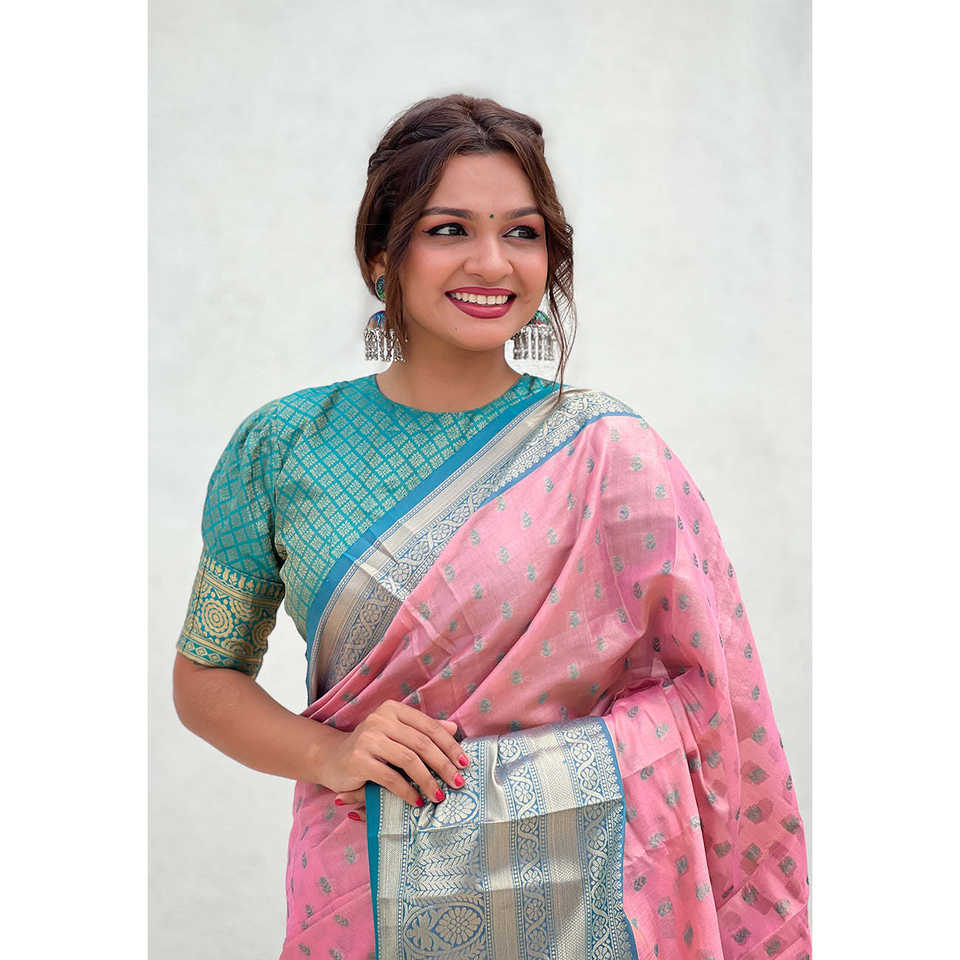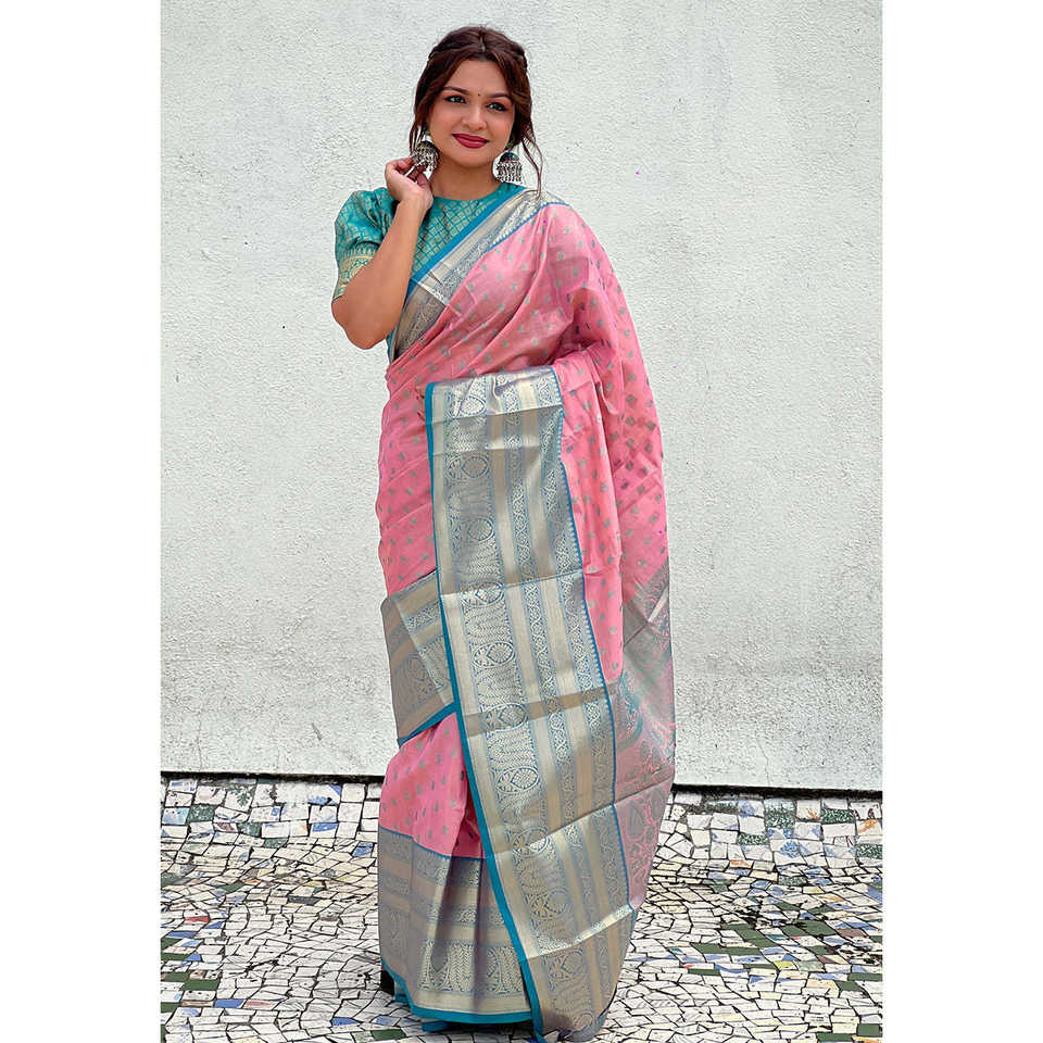 ผ้าไหมกันจิววารัมสีชมพูอ่อน ชุดราตรีแบบดั้งเดิมปักดิ้นทอง โดย Elite Weaves