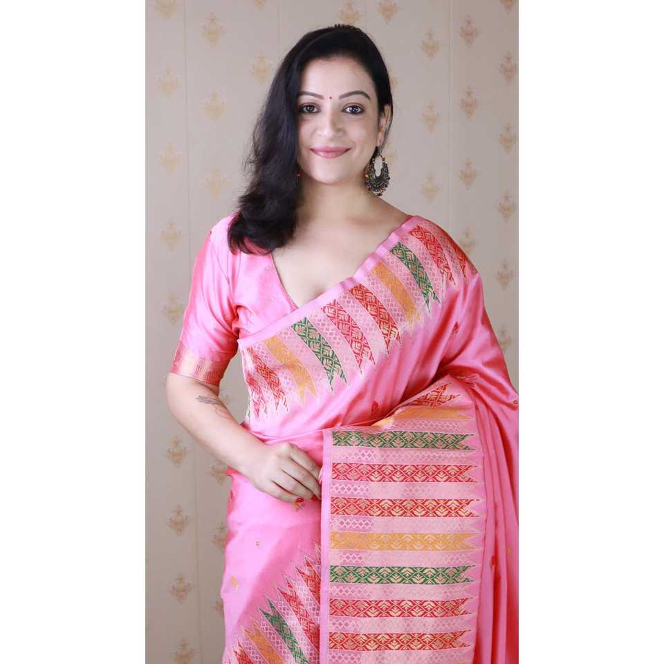 ผ้าซารีไหมเนื้อนุ่มสีชมพูอ่อน ปักลายมีนาการีด้วยด้ายซารี พร้อมขอบลายวัด สำหรับผู้หญิง พร้อมเสื้อและเสื้อเชิ้ต
