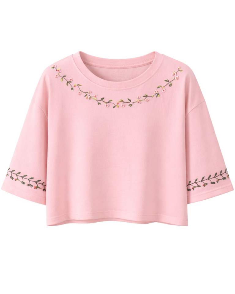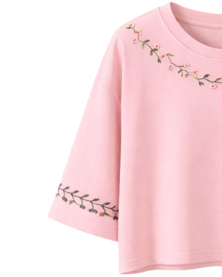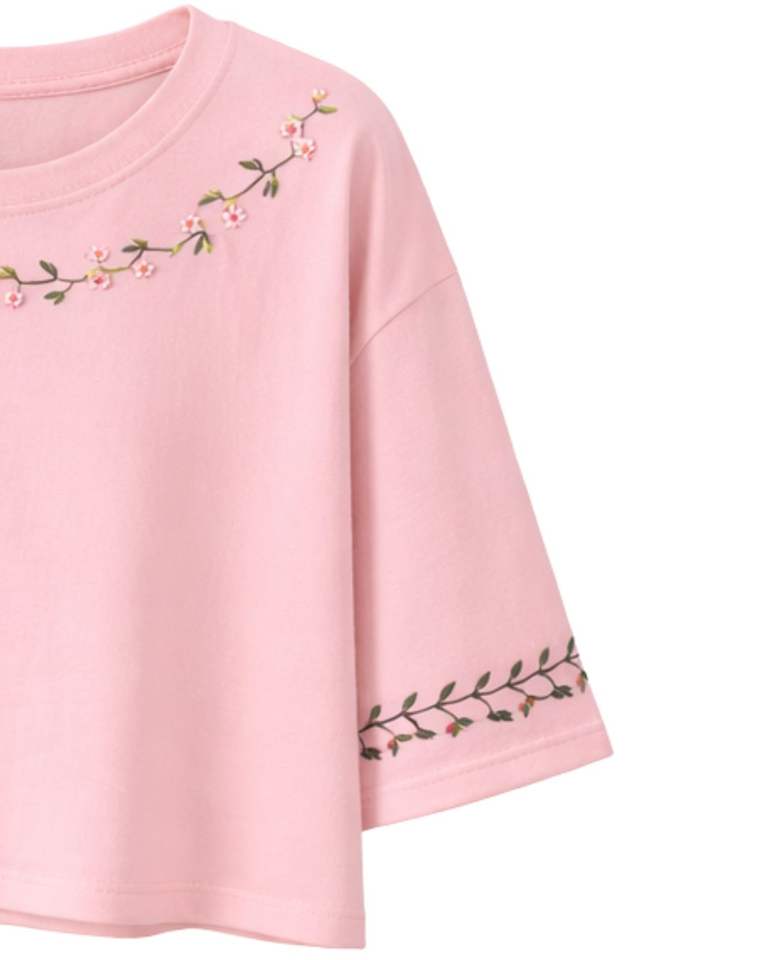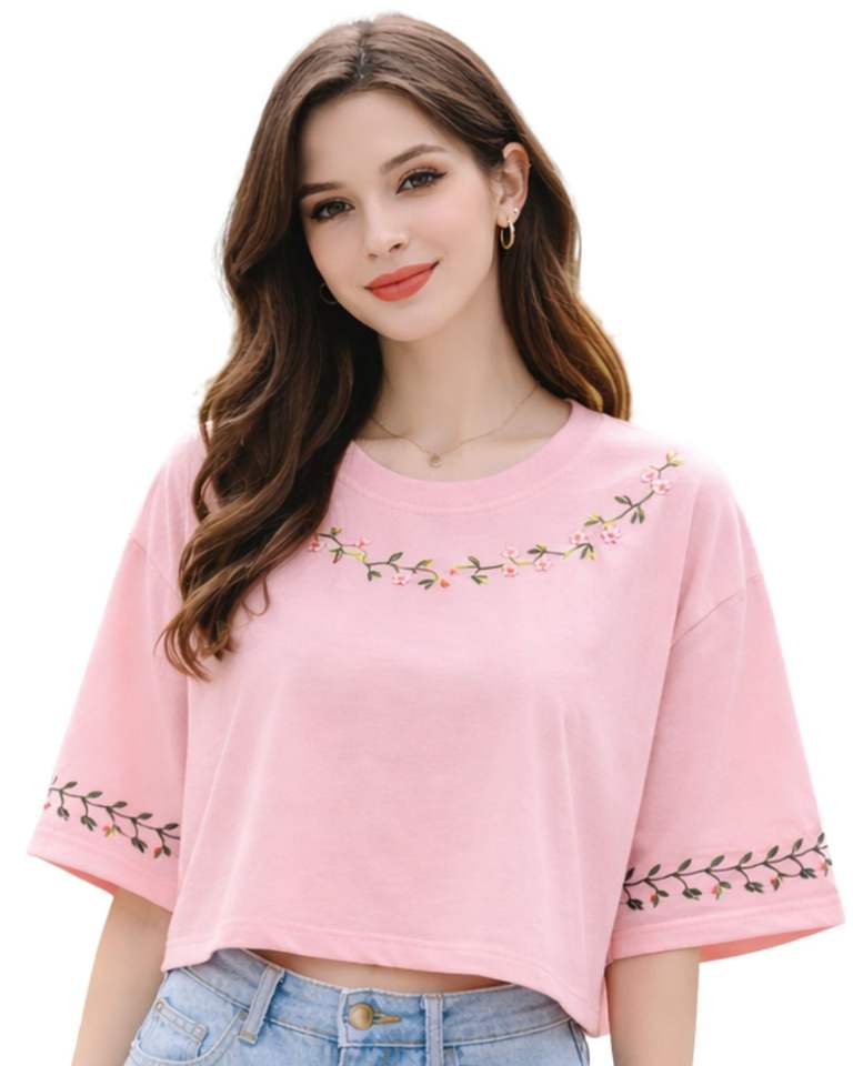 เสื้อยืดครอปผู้หญิงสีชมพูอ่อน ปักลายดอกไม้ แขนสั้น สไตล์ลำลอง แฟชั่น ผ้าคอตตอนผสม เนื้อนุ่ม เสื้อผู้หญิงสำหรับฤดูร้อน ขายส่ง