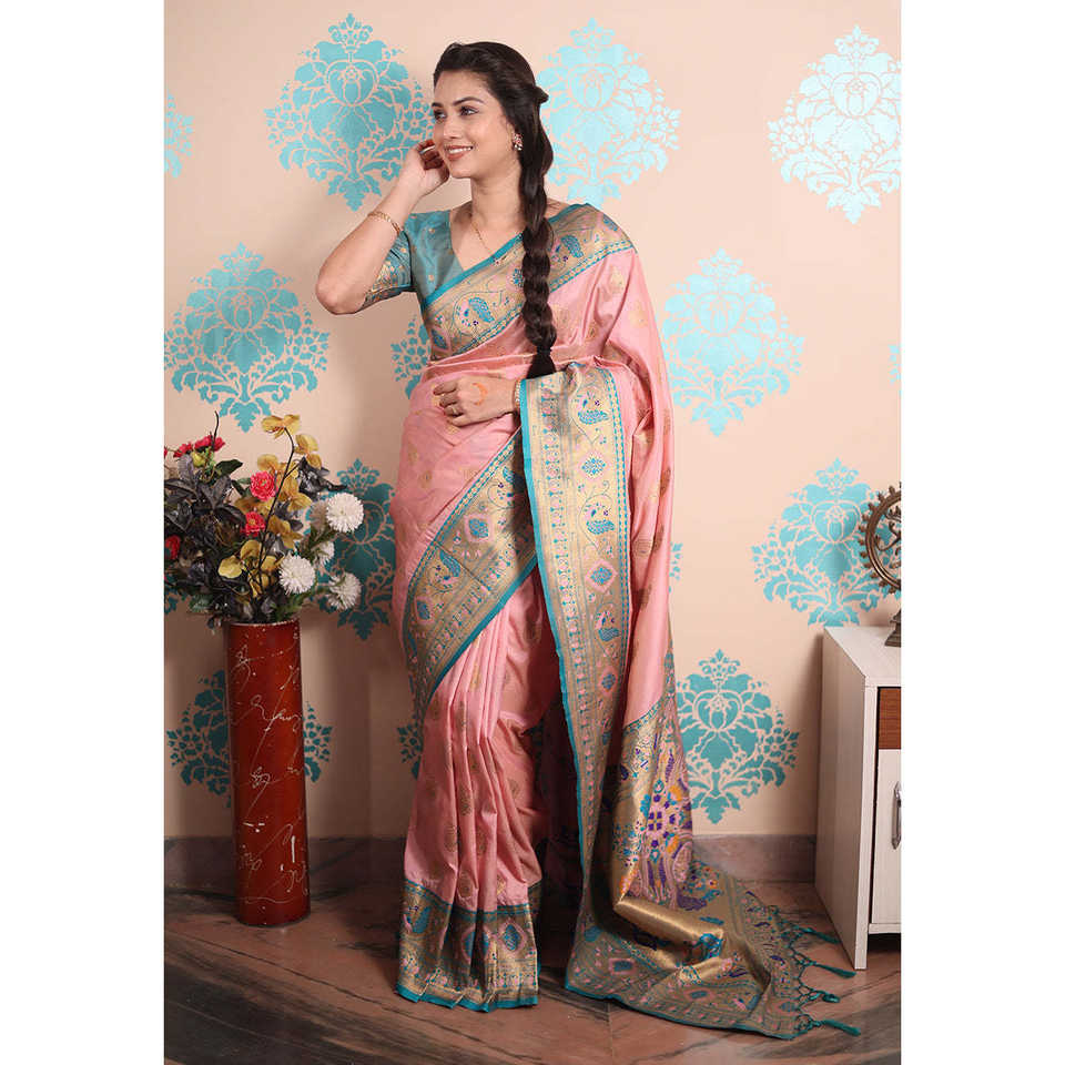 ผ้าไหมพิธานีสีชมพูอ่อนลายยูนิคแบบทอซารี งานฝีมือชั้นสูงจากอินเดียและปากีสถาน น้ำหนัก 650 กรัม