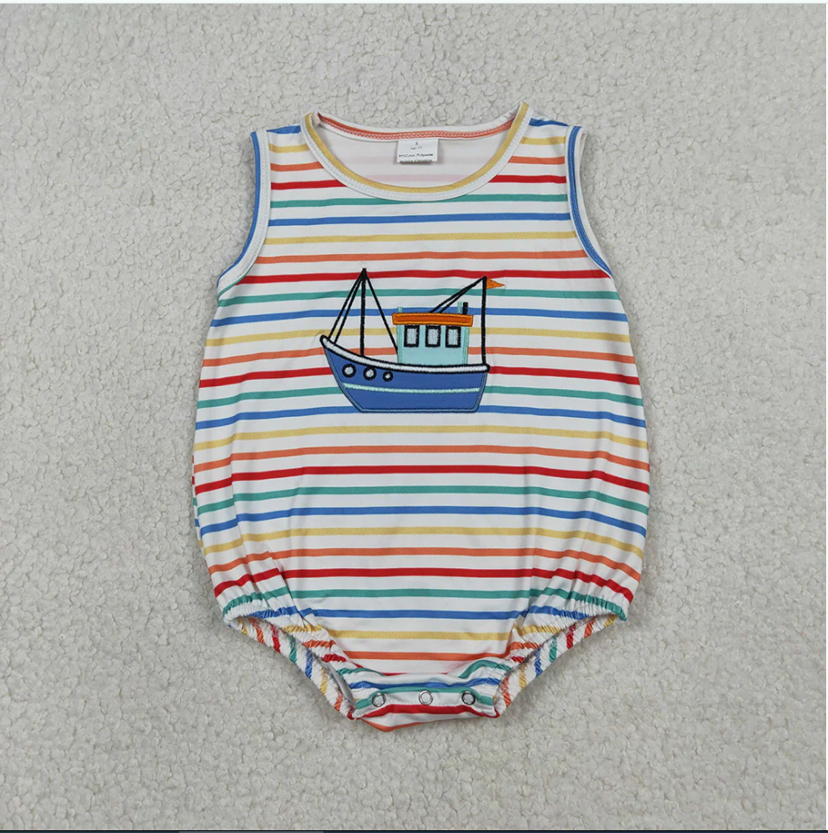 Baby SR3733 Ship Embroidery Stripes Print Baby Boys Summer Romper