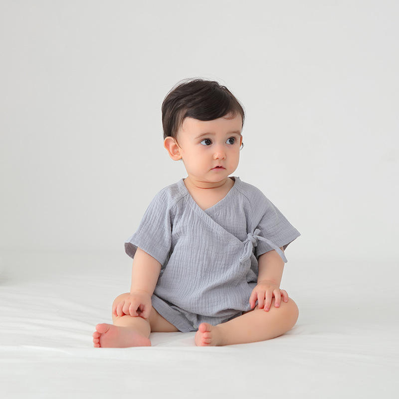 ชุดบอดี้สูทเด็กอ่อนแขนสั้นผ้ามัสลินคอตตอนสำหรับฤดูร้อน เด็กชายเด็กหญิง ชุดรอมเปอร์ผ้าก๊อซสามเหลี่ยม ชุดนอนผ้าฝ้าย