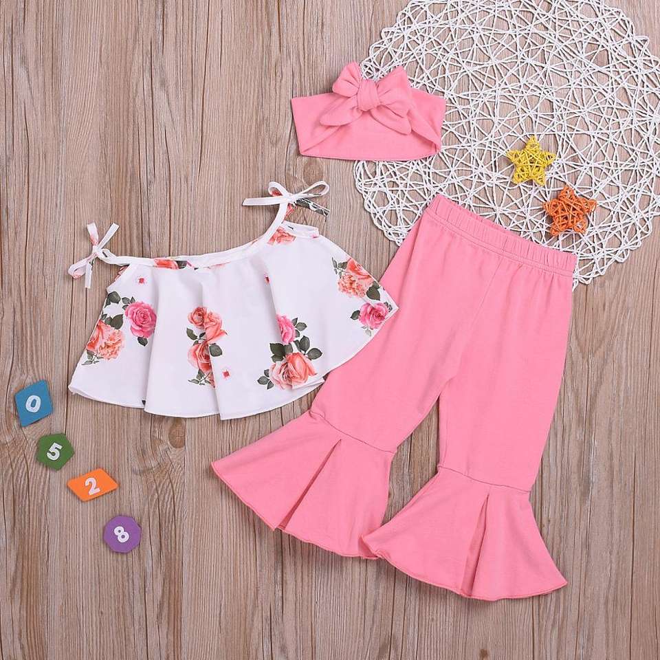 ชุดเสื้อผ้าเด็กผู้หญิงสำหรับฤดูร้อนขายส่ง ชุดเสื้อผ้าเด็กผู้หญิง 3 ชิ้น ประกอบด้วยที่คาดผม + เสื้อทรงกลีบบัว + กางเกงขาบาน