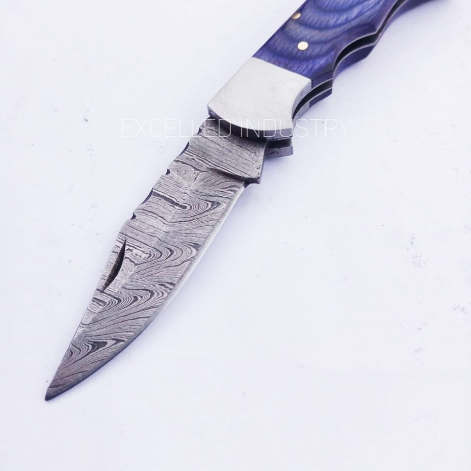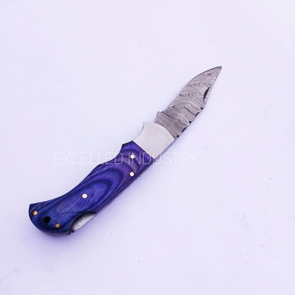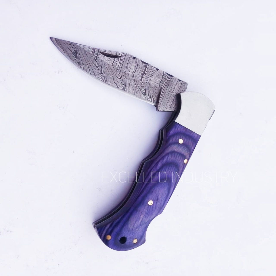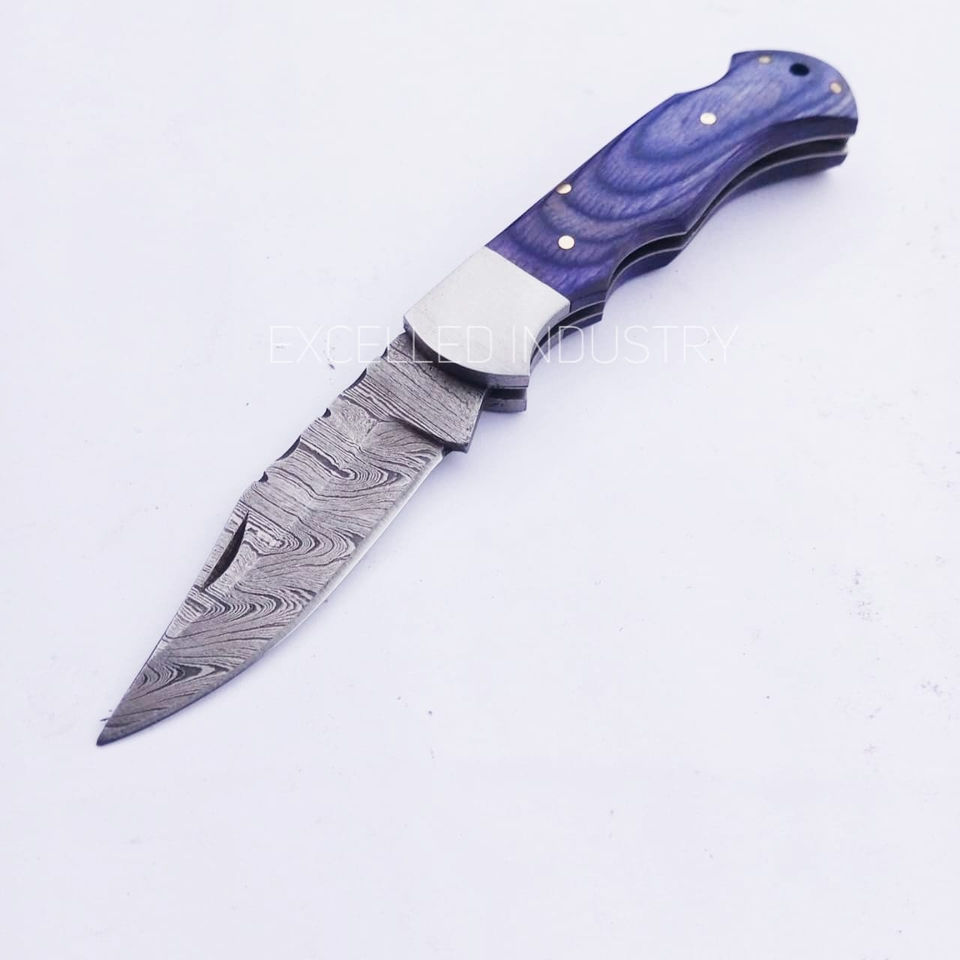 มีดพับเหล็กดามัสกัสทำมือ ด้ามไม้ปักก้า พร้อมปลอกหนัง รับประกัน 1 ปี เหมาะสำหรับล่าสัตว์และใช้งานอเนกประสงค์