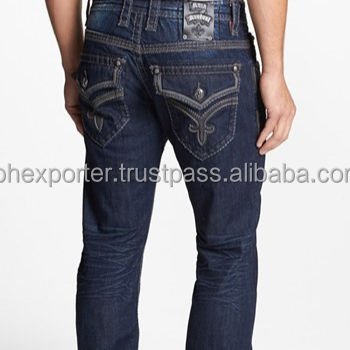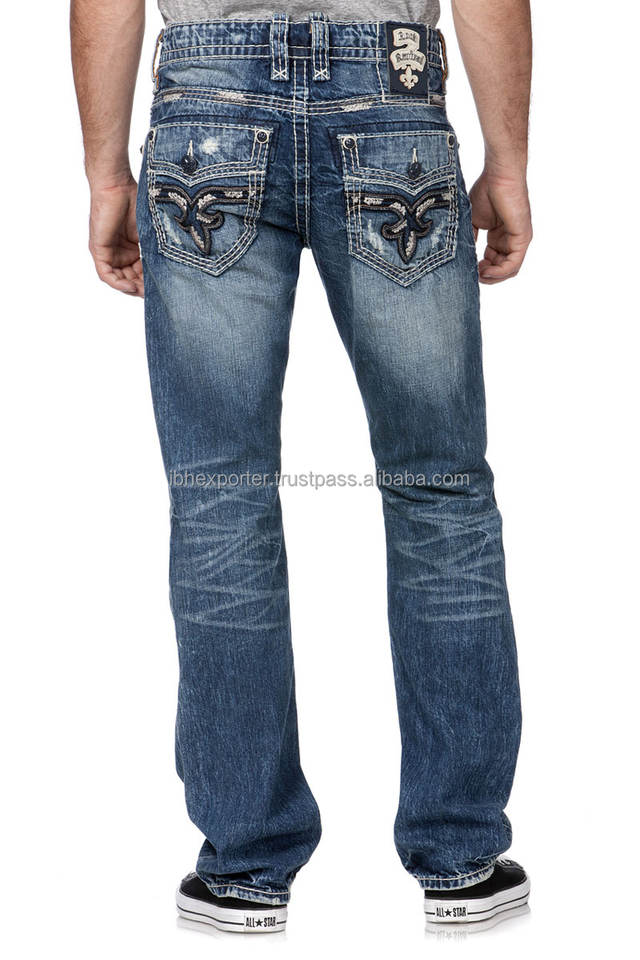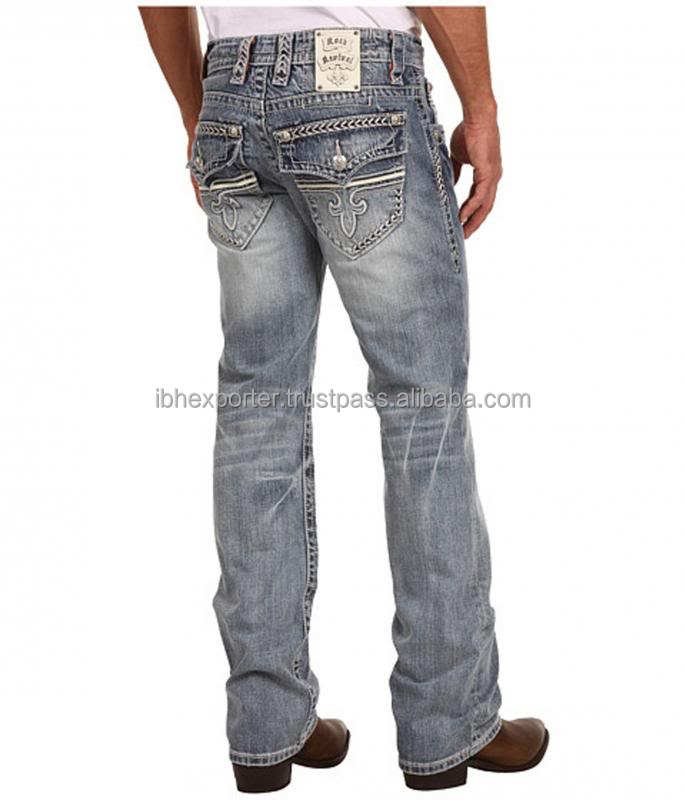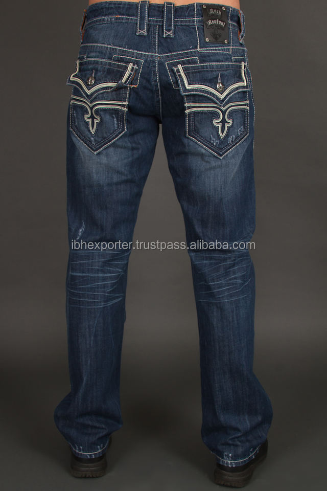 กางเกงยีนส์เดนิมธรรมดาปักลายมีกระเป๋าด้านหลัง