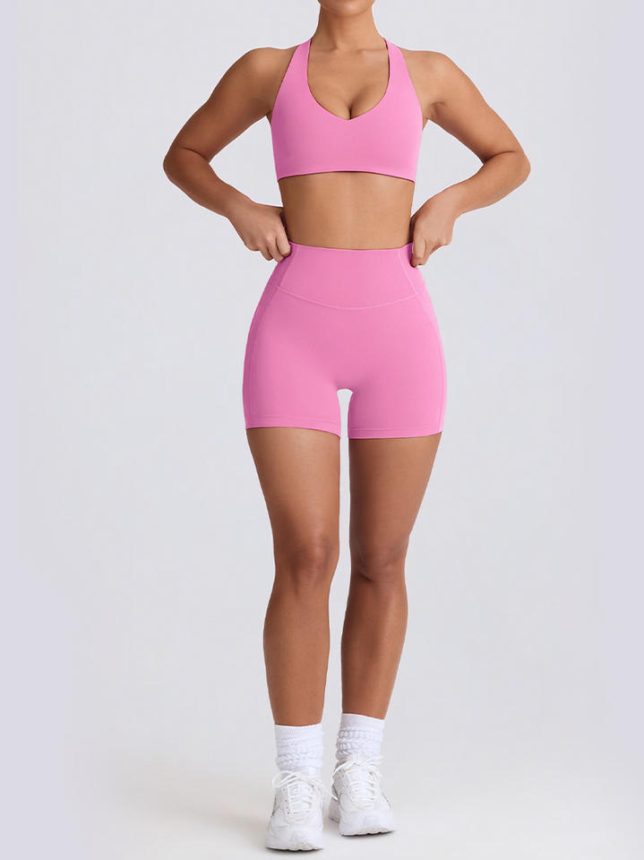 ชุดออกกำลังกายแบบไขว้สำหรับผู้หญิงชุดออกกำลังกายเล่นกีฬา2ชิ้นสำหรับวิ่งสีชมพูสำหรับฤดูร้อนรูปทรงด้านหลังสวยมาก