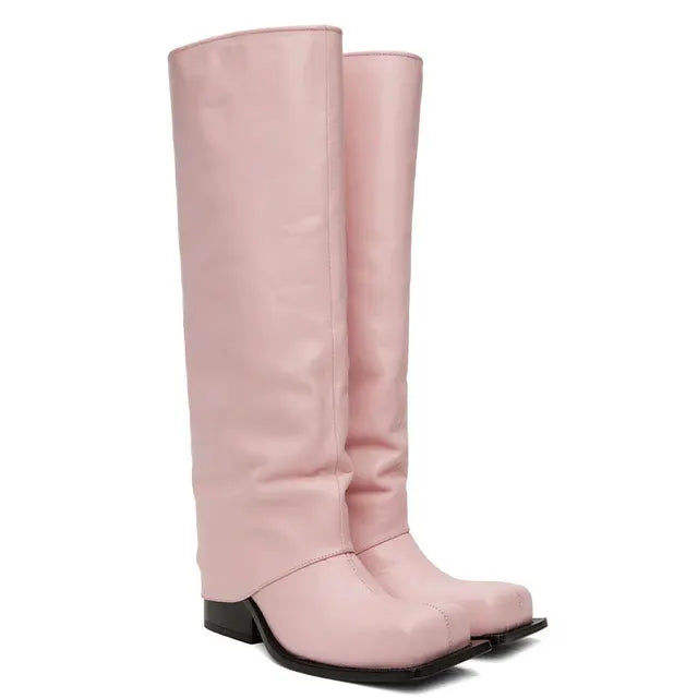 รองเท้าบูททรงบาร์เรลสีชมพูแบบสวมเหนือเข่า รุ่น Baddie พร้อมซิปปิด ดีไซน์เพิ่มความสูงเล็กน้อย เหมาะสำหรับทุกฤดูกาล พื้นรองเท้าด้านในทำจากยาง