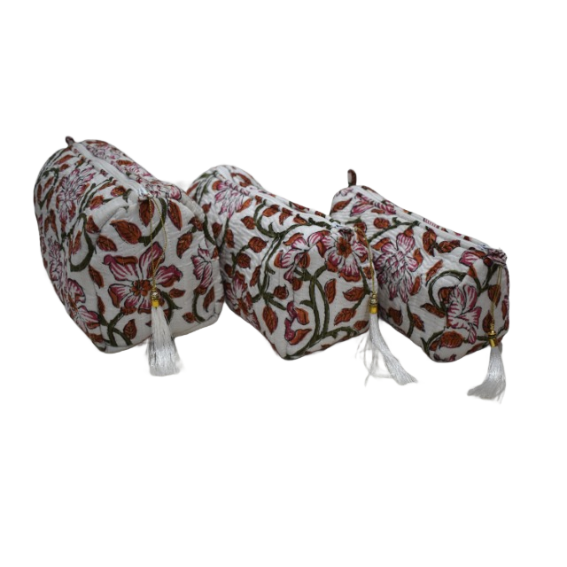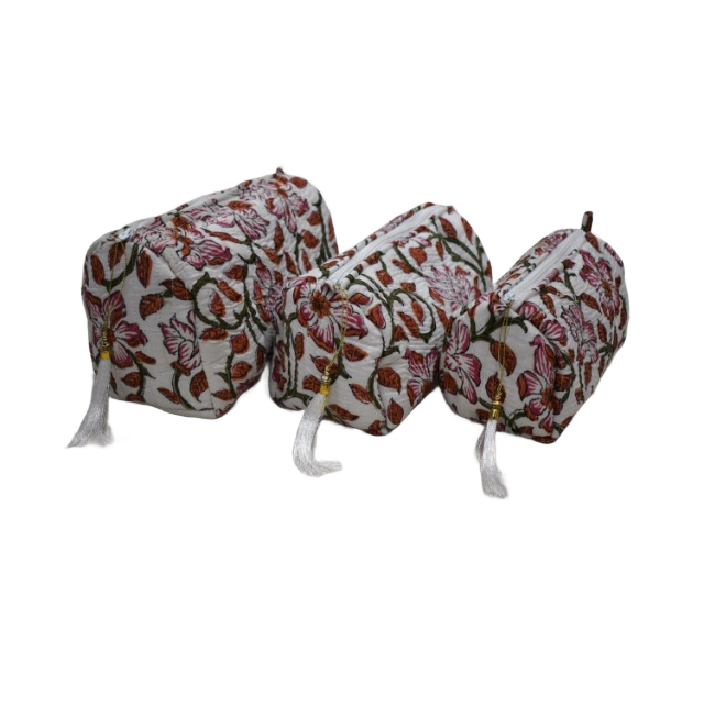 กระเป๋าเครื่องแป้งผ้าฝ้ายพิมพ์ลายชุดเครื่องสำอางกล่องเครื่องแป้งฟองน้ำพิมพ์ลายบล็อกทำด้วยมือชุดเดินทางผ้าฝ้ายอินเดีย
