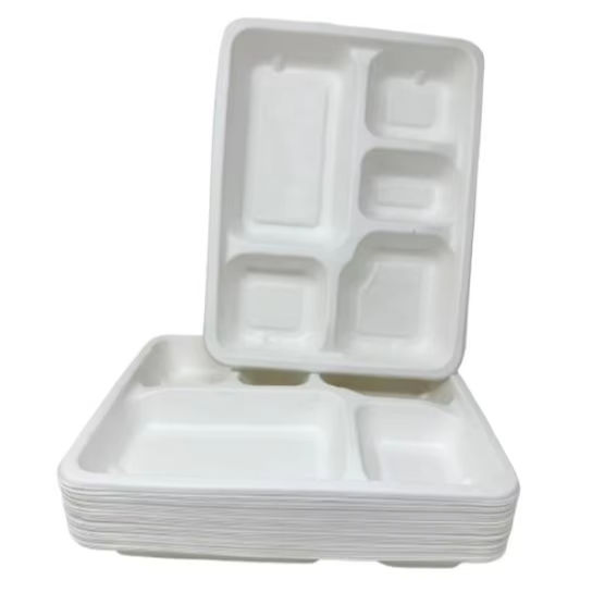ถาดอาหารกลางวันชานอ้อย5Cp จาน5ส่วนแบบบีบอัดทำในอินเดียสำหรับงานปาร์ตี้โรงเรียนและอาหาร