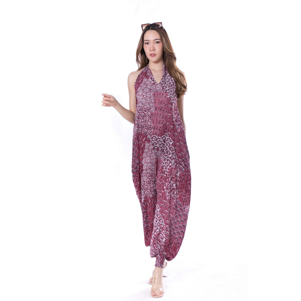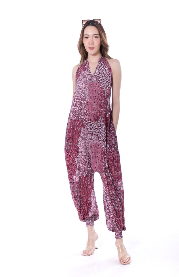 กางเกงทรงหลวมสำหรับผู้หญิงไซส์ใหญ่ สไตล์โบฮีเมียน กางเกงฮาเร็มโยคะ เดรสผู้หญิงแขนกุด เปิดหลังโชว์ผิว สีเบอร์กันดี