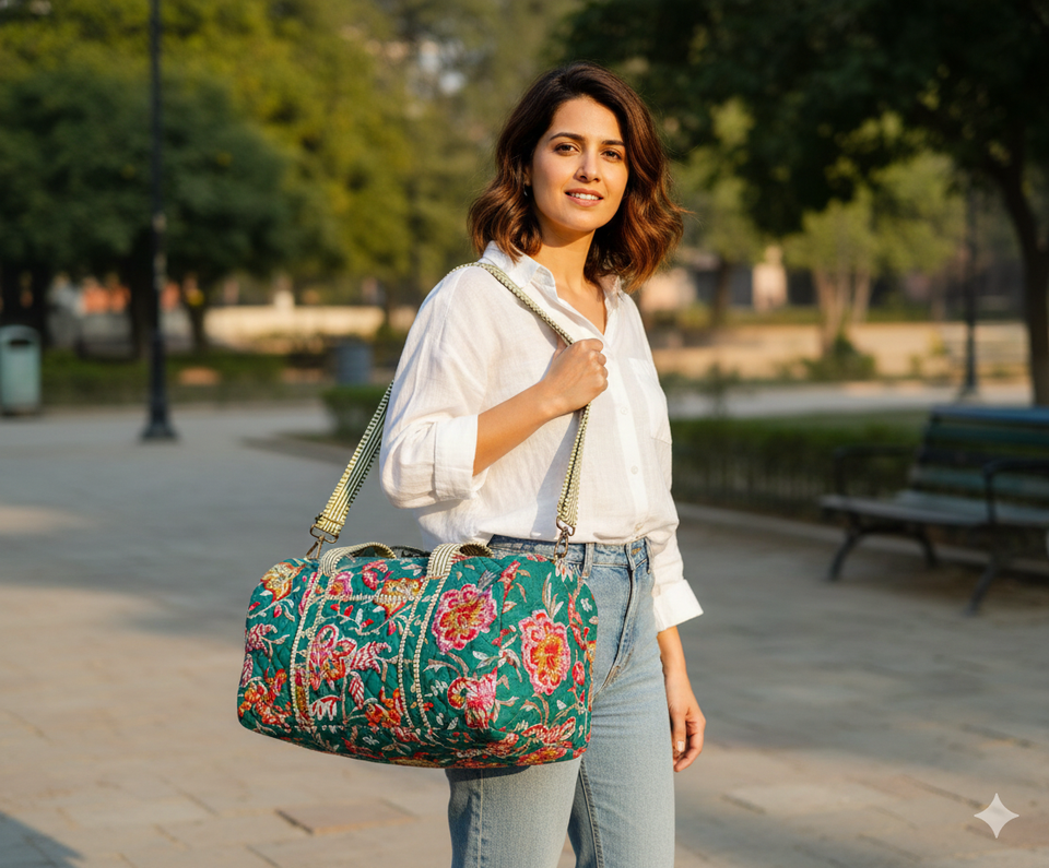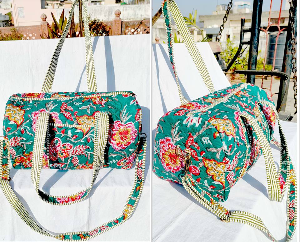 กระเป๋าผ้าฝ้ายแบบควิลท์พร้อมโบว์ระบาย รักษ์โลกและทนทาน ปิดด้วยซิป สไตล์ลำลอง/กีฬา/เดินทาง ผลิตในรัฐราชสถาน