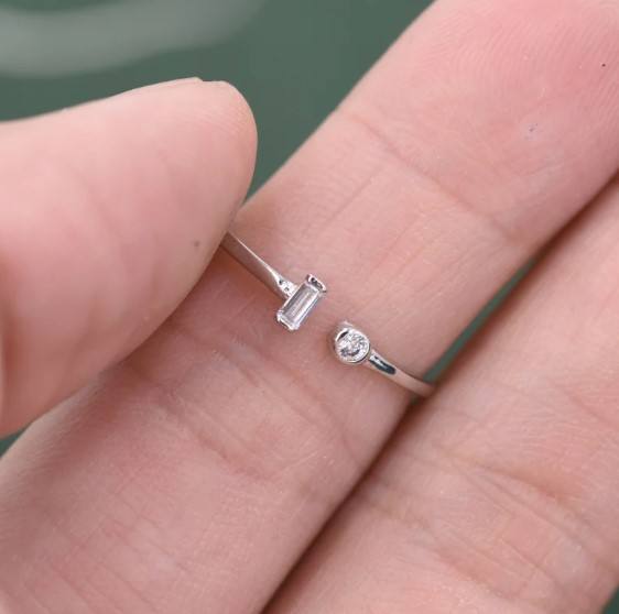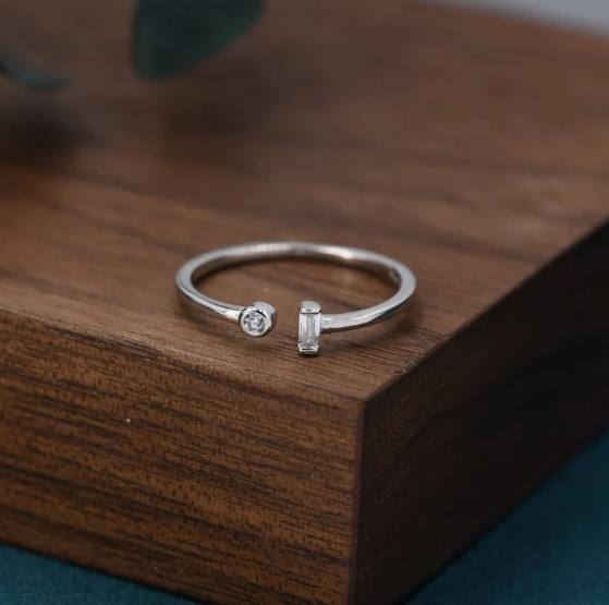 แหวนเปิดทรงบาแกตต์ประดับเพชร CZ เงินสเตอร์ลิงหรือทอง แหวนบาแกตต์ปรับขนาดได้ แหวนเพชร CZ สไตล์มินิมอล แหวนทรงเรขาคณิต
