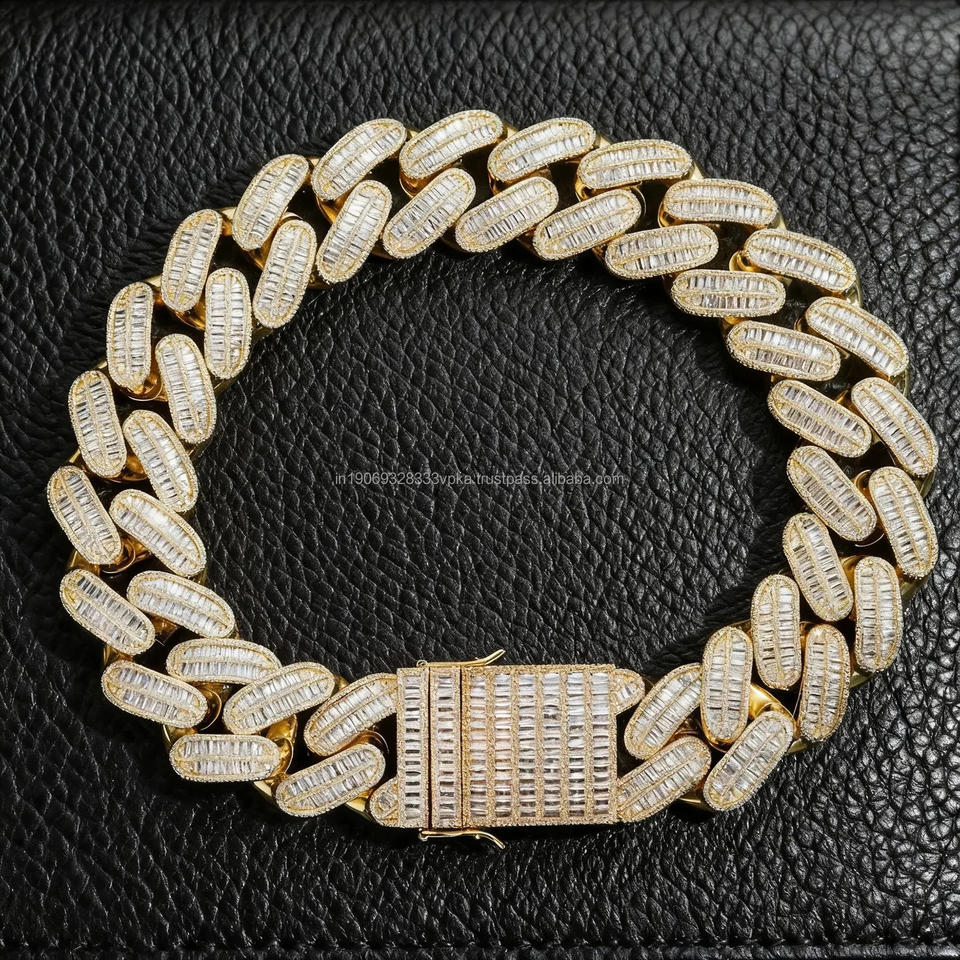 สร้อยข้อมือ/สร้อยคอผู้ชายแบบ Cuban Link ประดับเพชรโมอิสซาไนต์ทรงบาแกตต์และทรงกลม ของขวัญวันครบรอบ เครื่องประดับฮิปฮอป