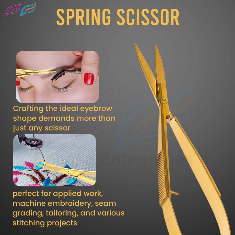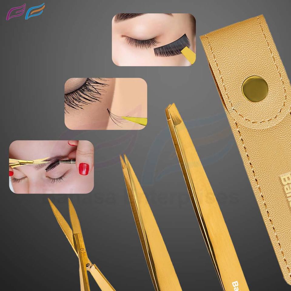 Bahasa Pro ชุดกรรไกรตัดคิ้วและขนตาสแตนเลสสีทอง3ชิ้นปลายแหลมพร้อมกรรไกรตัดสปริงโดย Bahasa Pro